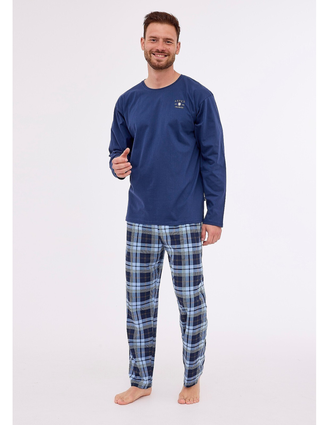 Vyriškos pižamos - aukštos kokybės medvilnė - vientisas trikotažas ilgomis rankovėmis - pusapvalė iškirptė - ilgos languotos kelnės - medvilniniu šuniuku apsiūta elastinė juosta