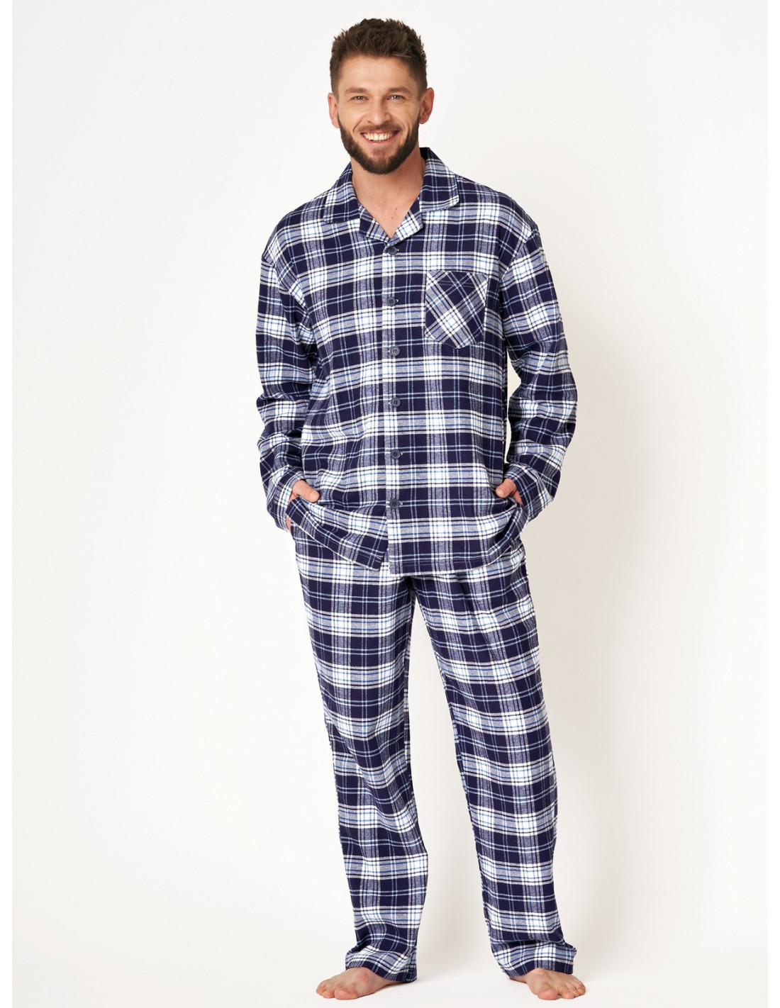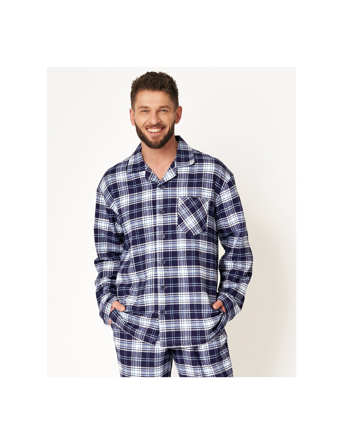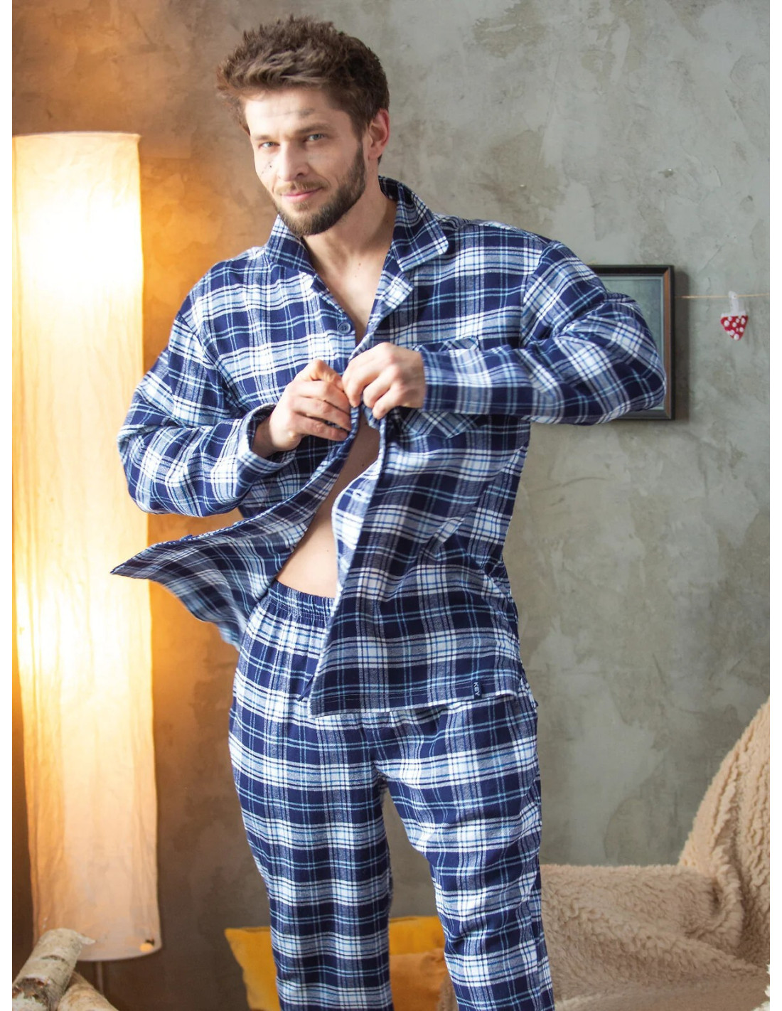 Vyriška pižama iš natūralios medvilnės flanelės - languotas raštas - palaidinė ilgomis rankovėmis - su apykakle, užsegama priekyje - prisiūta kišenė ant krūtinės - ilgos kelnės su kišenėmis - tiesus kojų kirpimas - patogus elastinis medvilninis juosmuo