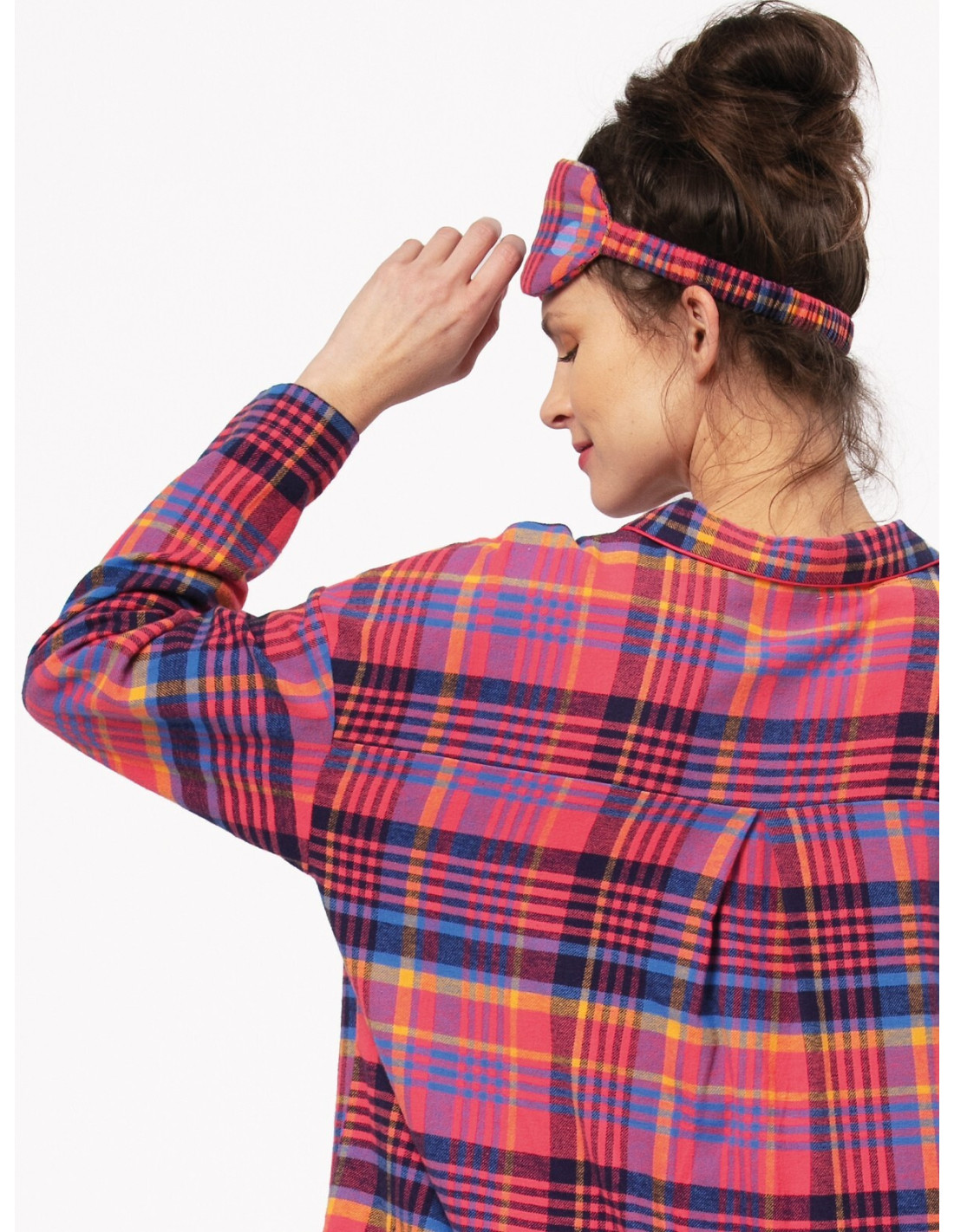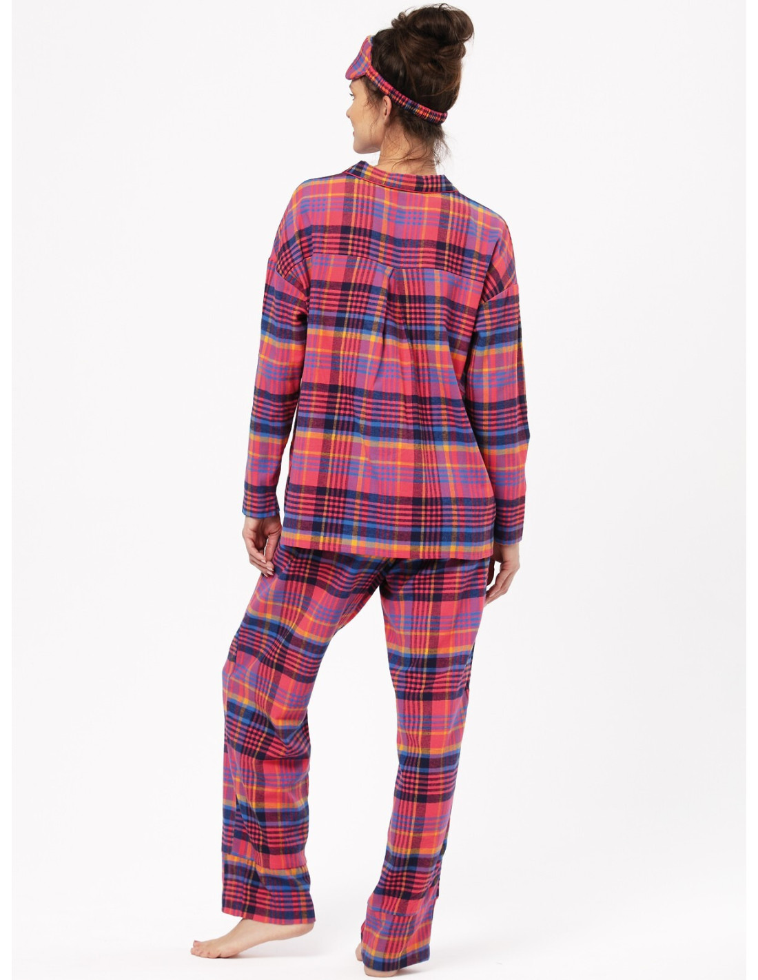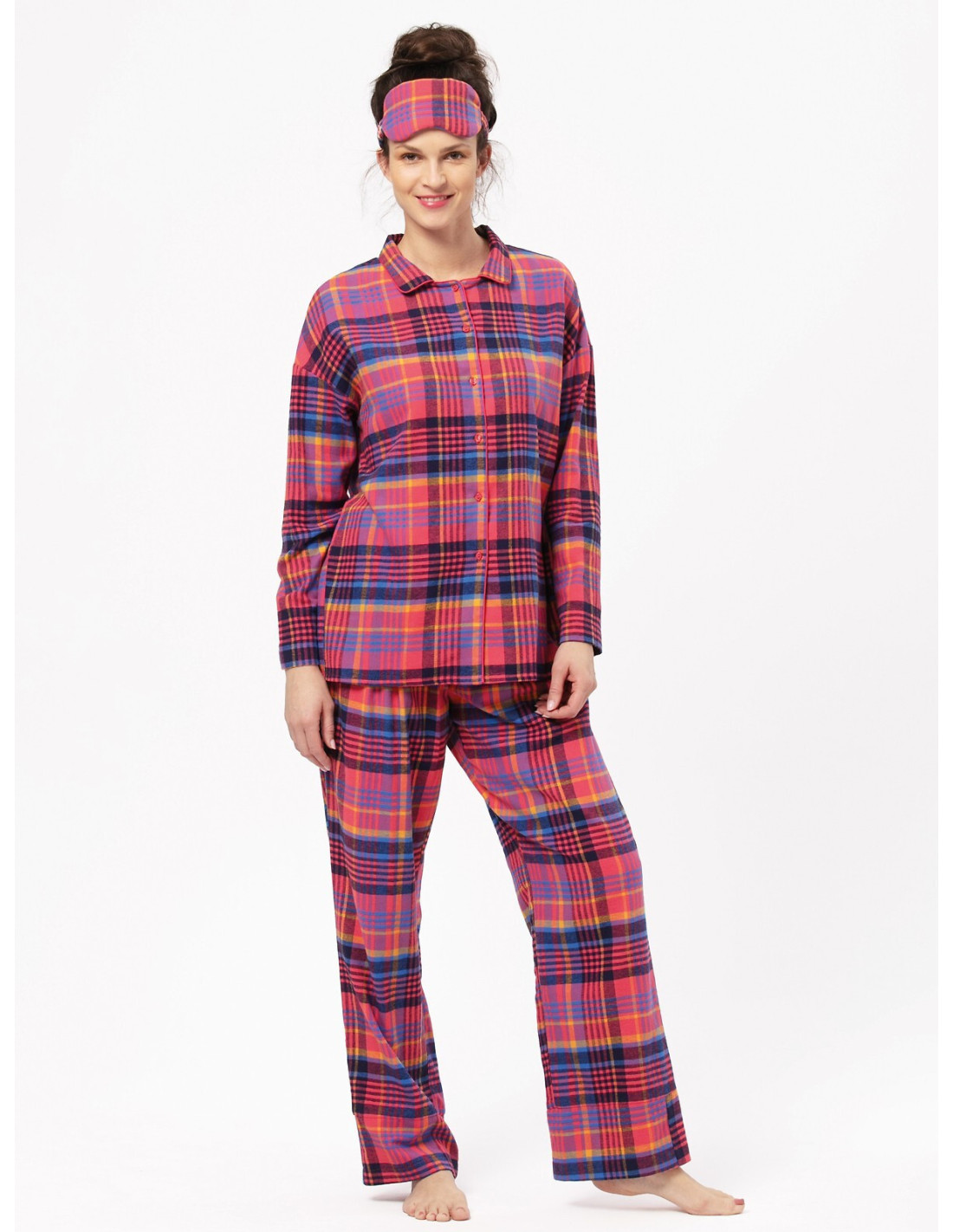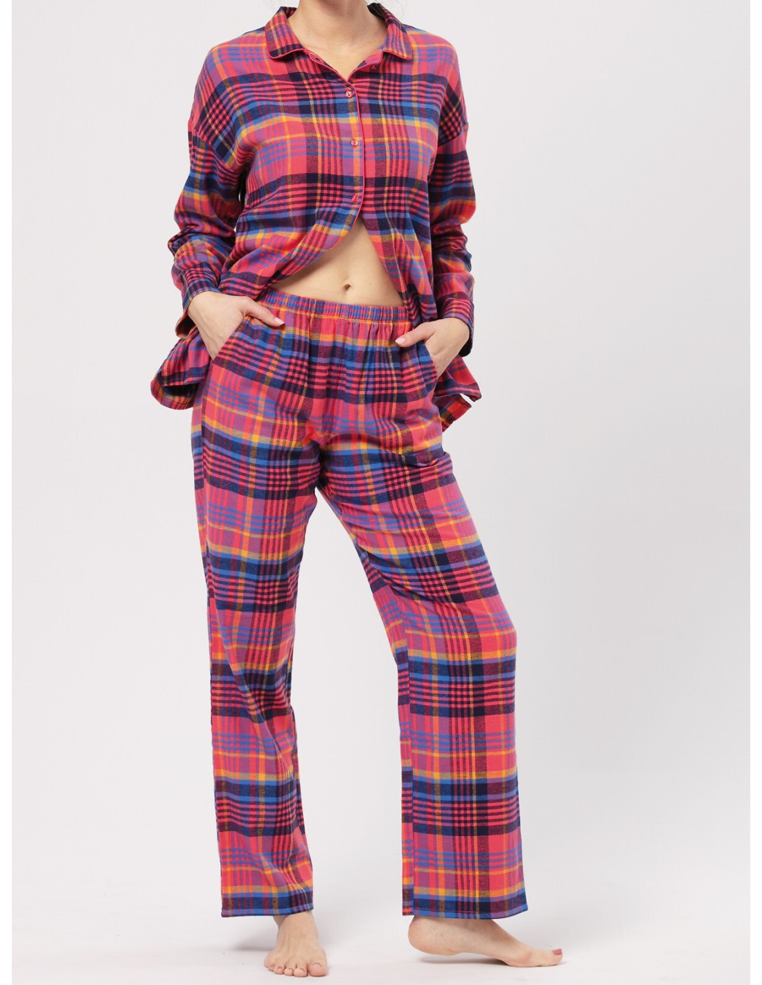 Klasikinė flanelinė moteriška pižama - languotos medvilnės - palaidinė ilgomis rankovėmis - su apykakle, užsegama sagomis - kartu su ilgomis kelnėmis - tiesus kojų kirpimas - patogios kišenės ant klubų - patogus elastinis medvilninis juosmuo