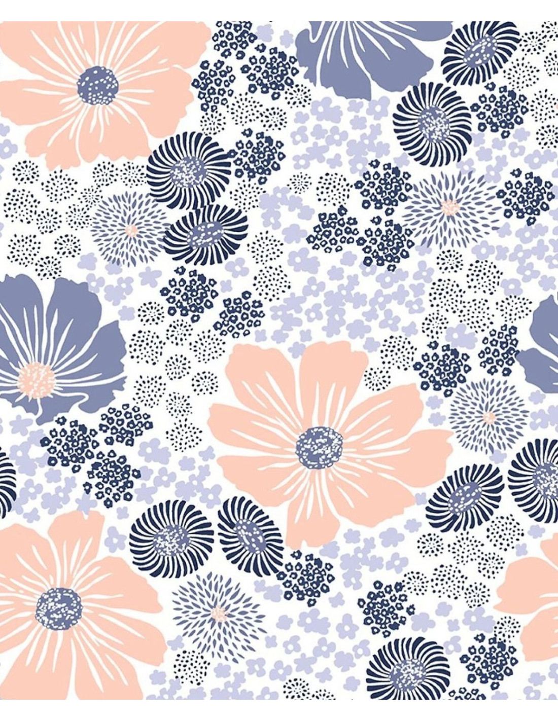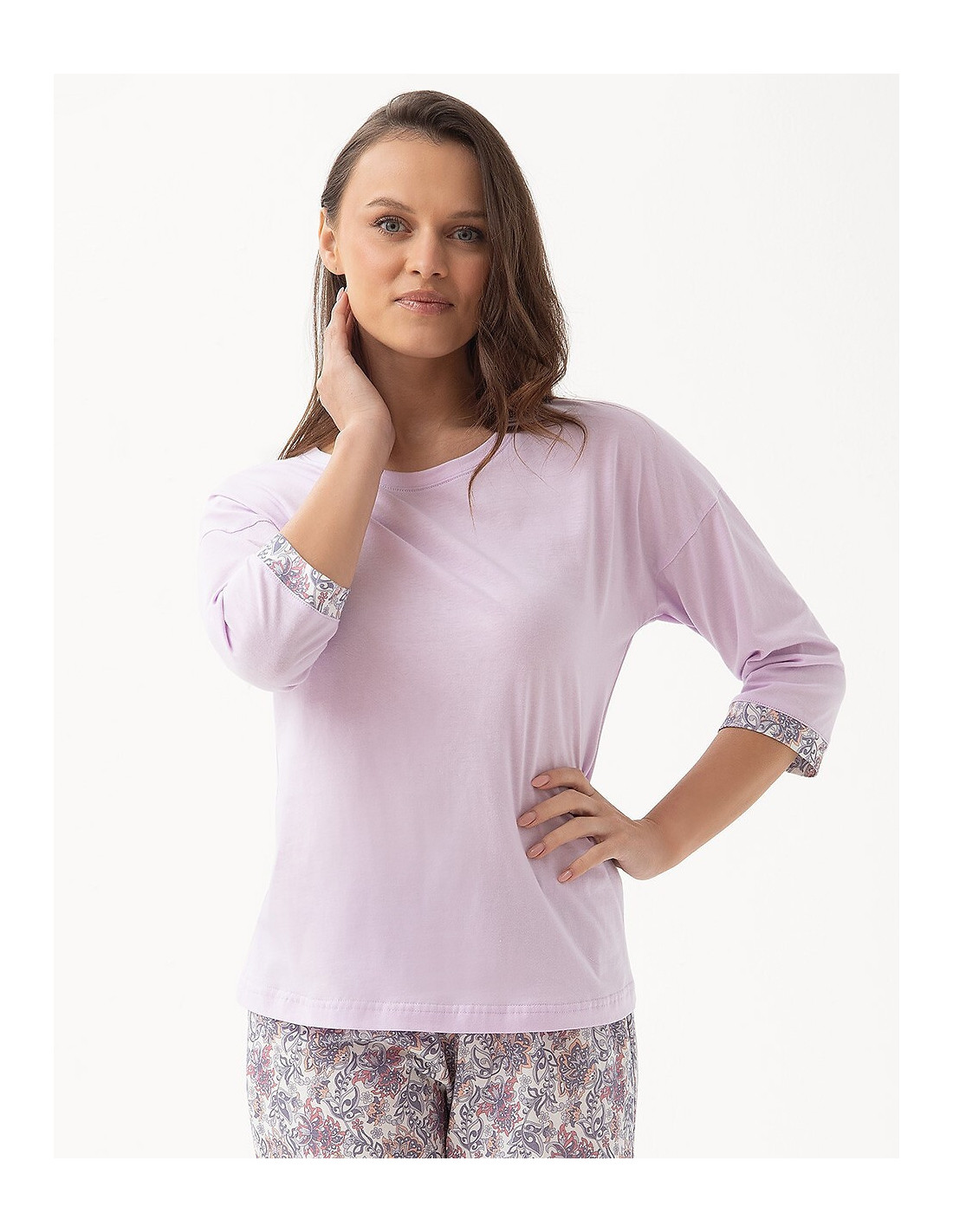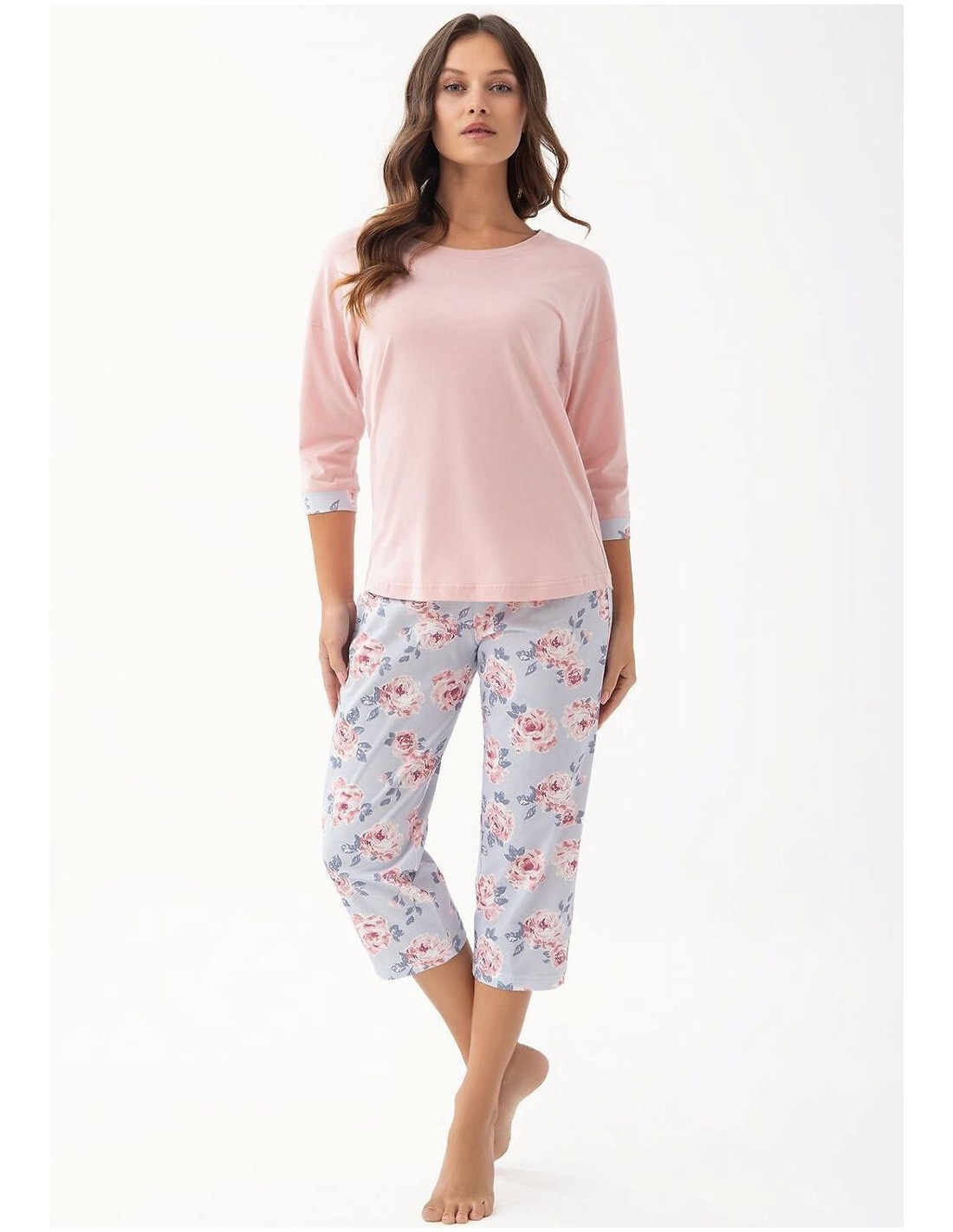 Moteriška medvilninė pižama - marškinėliai 3/4 rankovėmis - pusapvalė iškirptė - raštuotu audiniu apsiūtos rankovės - tinklinės kelnės su gėlių raštu