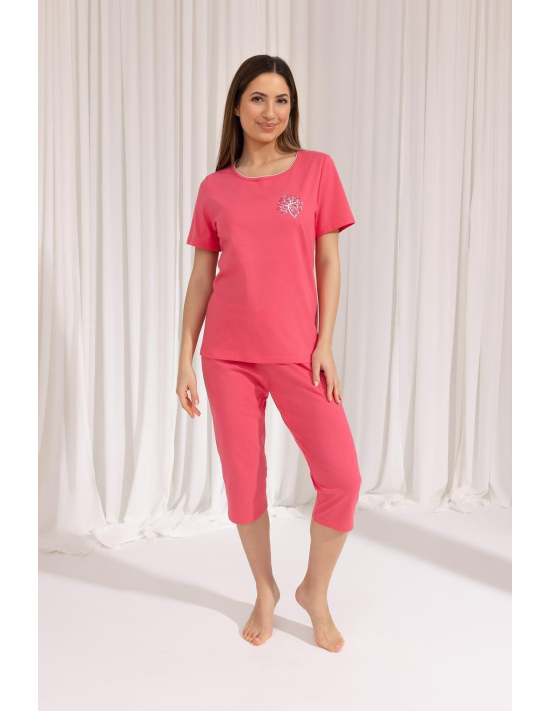 Moteriškos pižamos - aukštos kokybės medvilnė - marškinėliai trumpomis rankovėmis - apvali iškirptė - gėlių raštas ant krūtinės - tinklinės kelnės - medvilne apsiūta elastinga juosta juosmens srityje