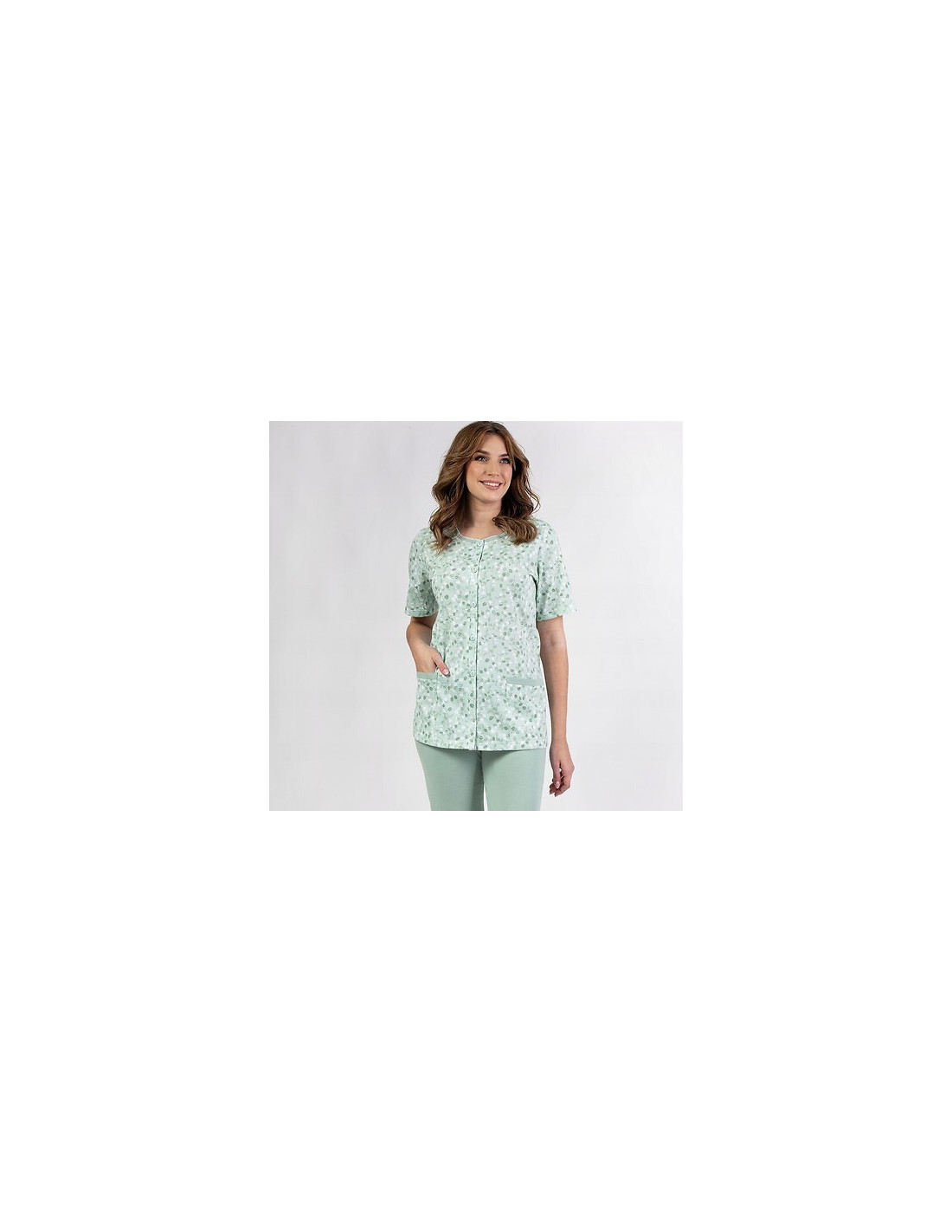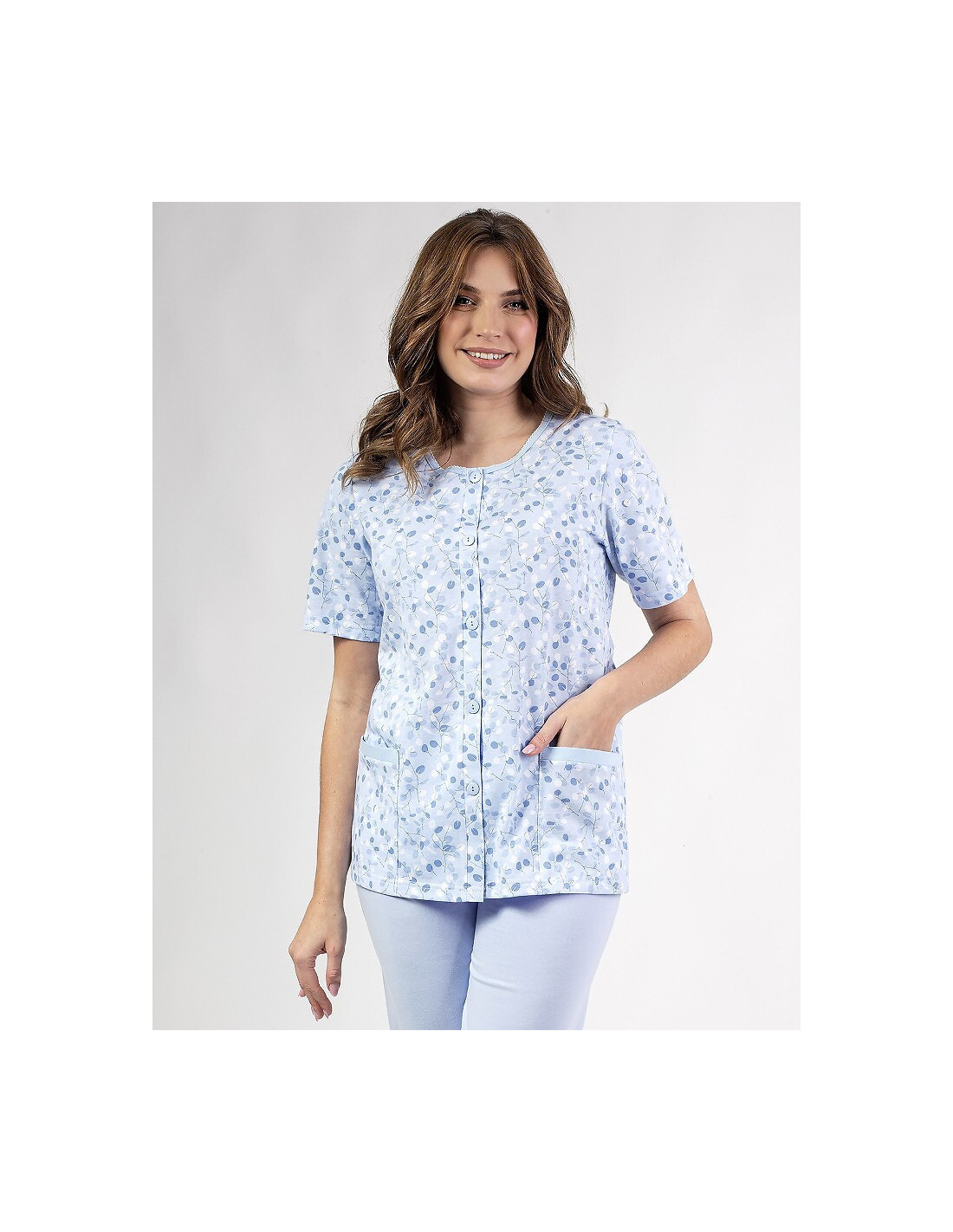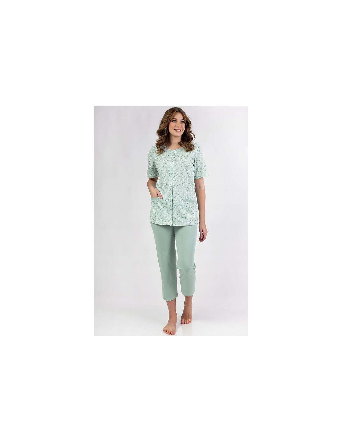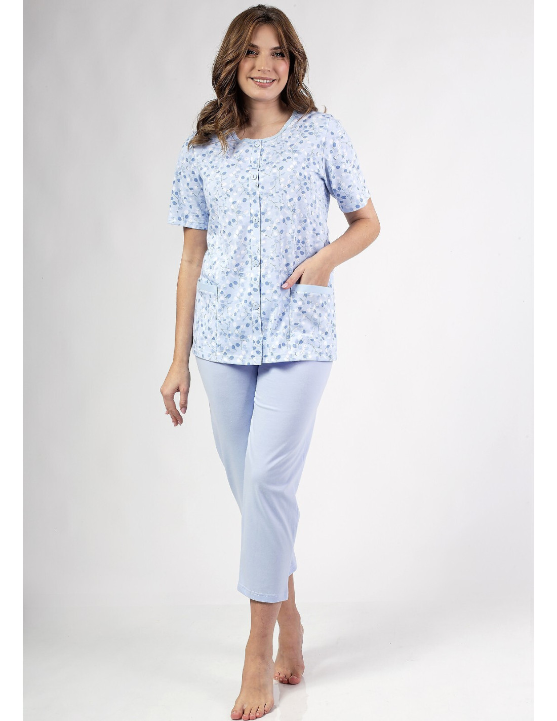 Moteriškos pižamos - pagaminta iš švelnios medvilnės - raštuoti marškinėliai - trumpomis rankovėmis - užsegama sagomis - dvi prisiūtos kišenės apačioje - 3/4 ilgio vienspalvės kelnės