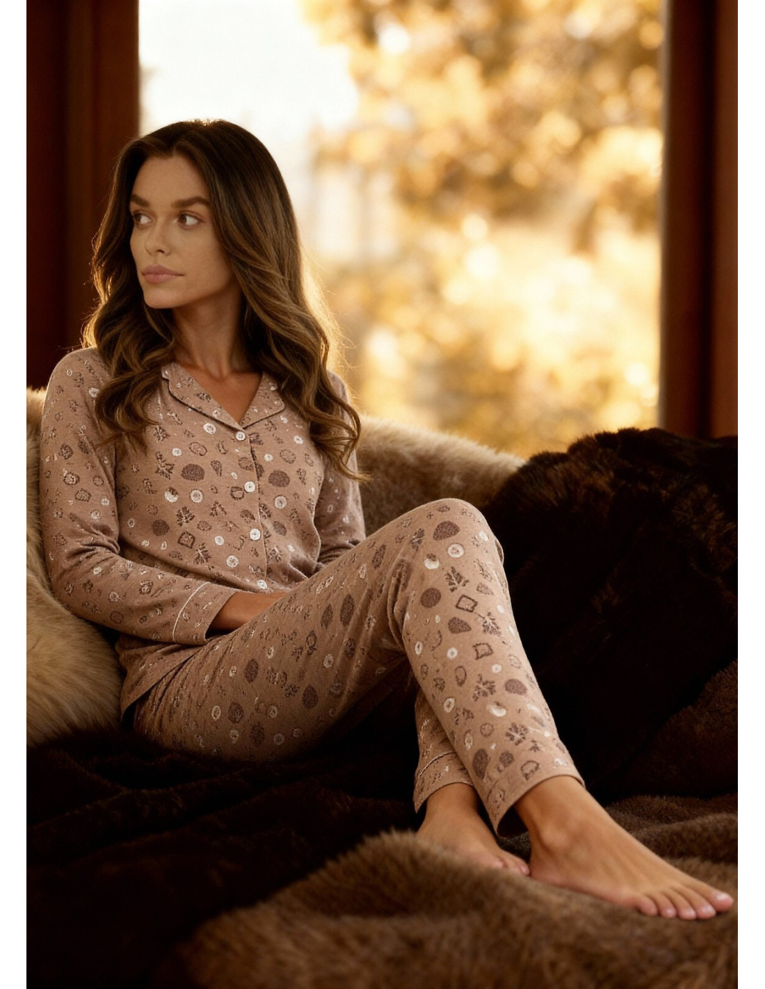 Moteriškos pižamos - aukštos kokybės medvilnė - sausainių raštas - palaidinė ilgomis rankovėmis - su apykakle, užsegama priekyje - kišenės su lopais ties apačia - ilgos kelnės - liemuo su elastine juosta, apsiūta medvilne