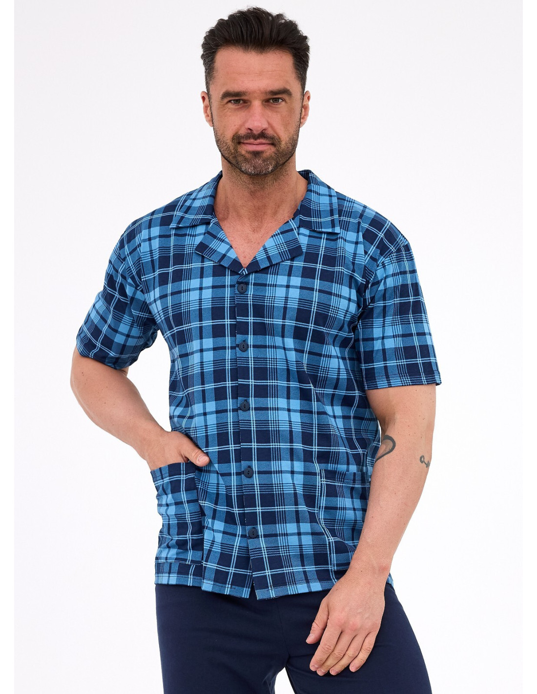 Vyriška pižama su užtrauktuku - aukštos kokybės medvilnė - languota, sagomis užsegama palaidinė - trumpomis rankovėmis - su apykakle, su kišenėmis - vienspalvės ilgos kelnės