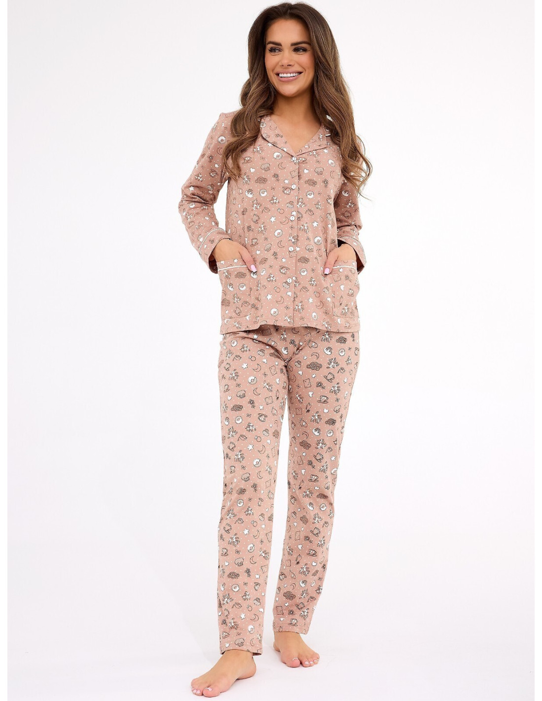 Moteriškos pižamos - aukštos kokybės medvilnė - sausainių raštas - palaidinė ilgomis rankovėmis - su apykakle, užsegama priekyje - kišenės su lopais ties apačia - ilgos kelnės - juosmuo su elastine juosta, apsiūta medvilne