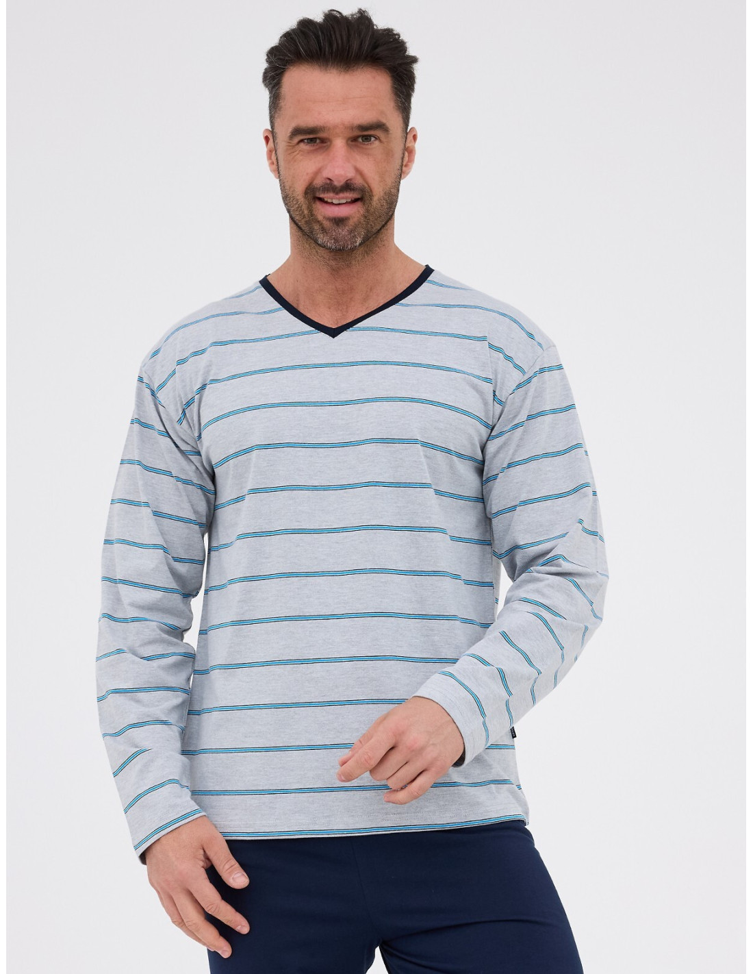 Vyriškos pižamos - aukštos kokybės medvilnė - dryžuoti marškinėliai ilgomis rankovėmis - smailėjanti iškirptė - vienspalvės kelnės ilgomis kelnėmis - patogus elastinis juosmuo - supakuota į dėžutę