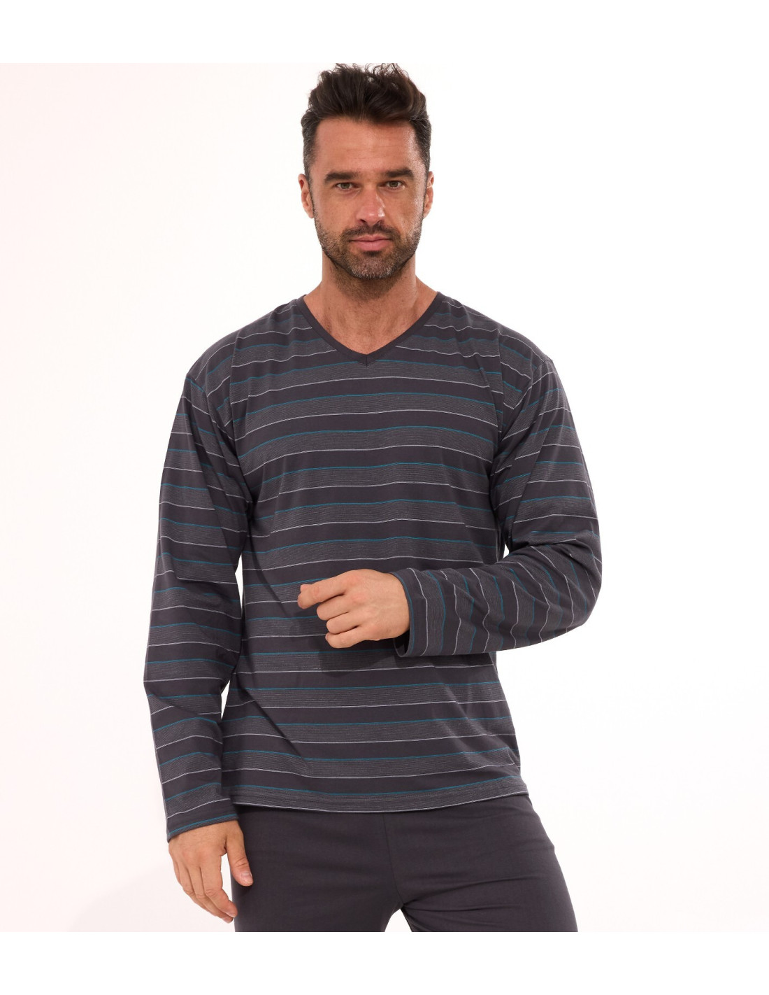 Vyriškos pižamos - aukštos kokybės medvilnė - dryžuoti marškinėliai ilgomis rankovėmis - smailėjanti iškirptė - vienspalvės kelnės ilgomis kelnėmis - patogus elastinis juosmuo - supakuota į dėžutę