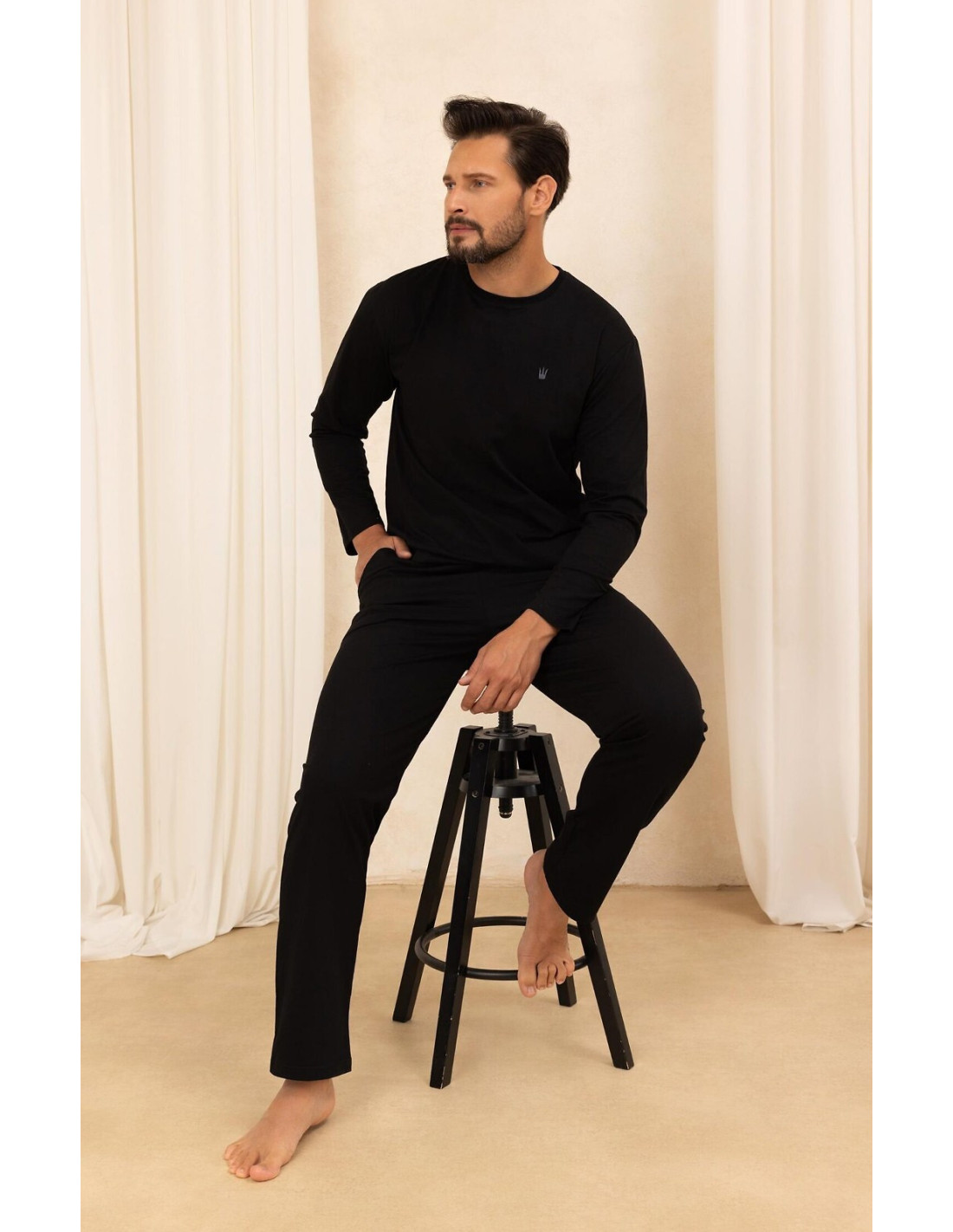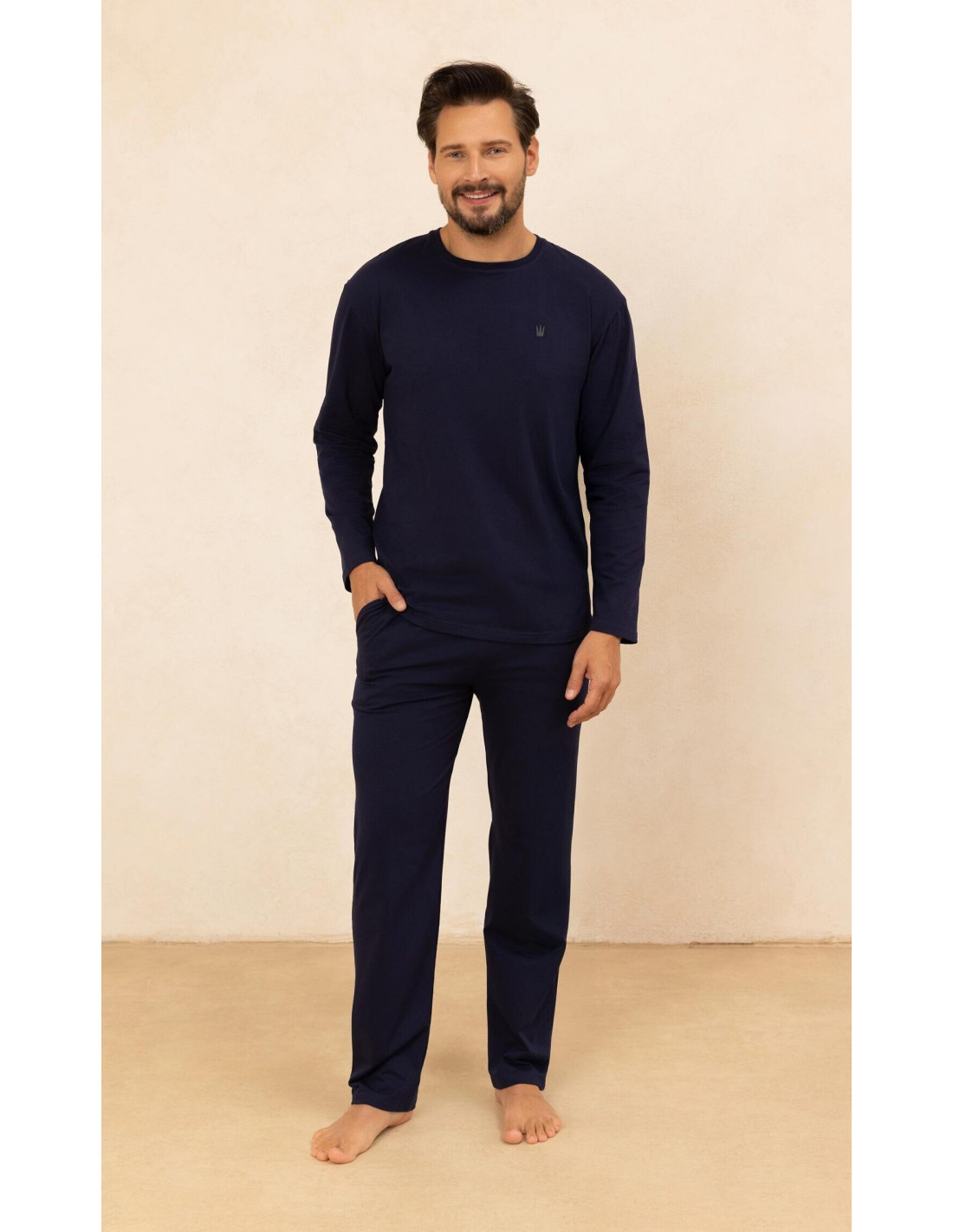 Piżama męska - koszulka z długim rękawem - półokrągły dekolt - do kompletu długie, gładkie spodnie z kieszeniami