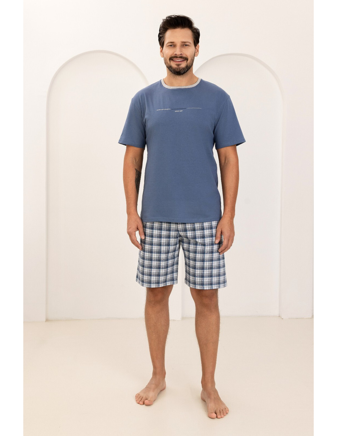 Bawełniana piżama męska - koszulka z krótkim rękawem - dekolt w szpic - krótkie spodenki w kratkę - w pasie gumka obszyta bawełną