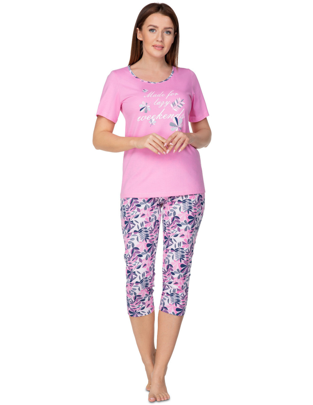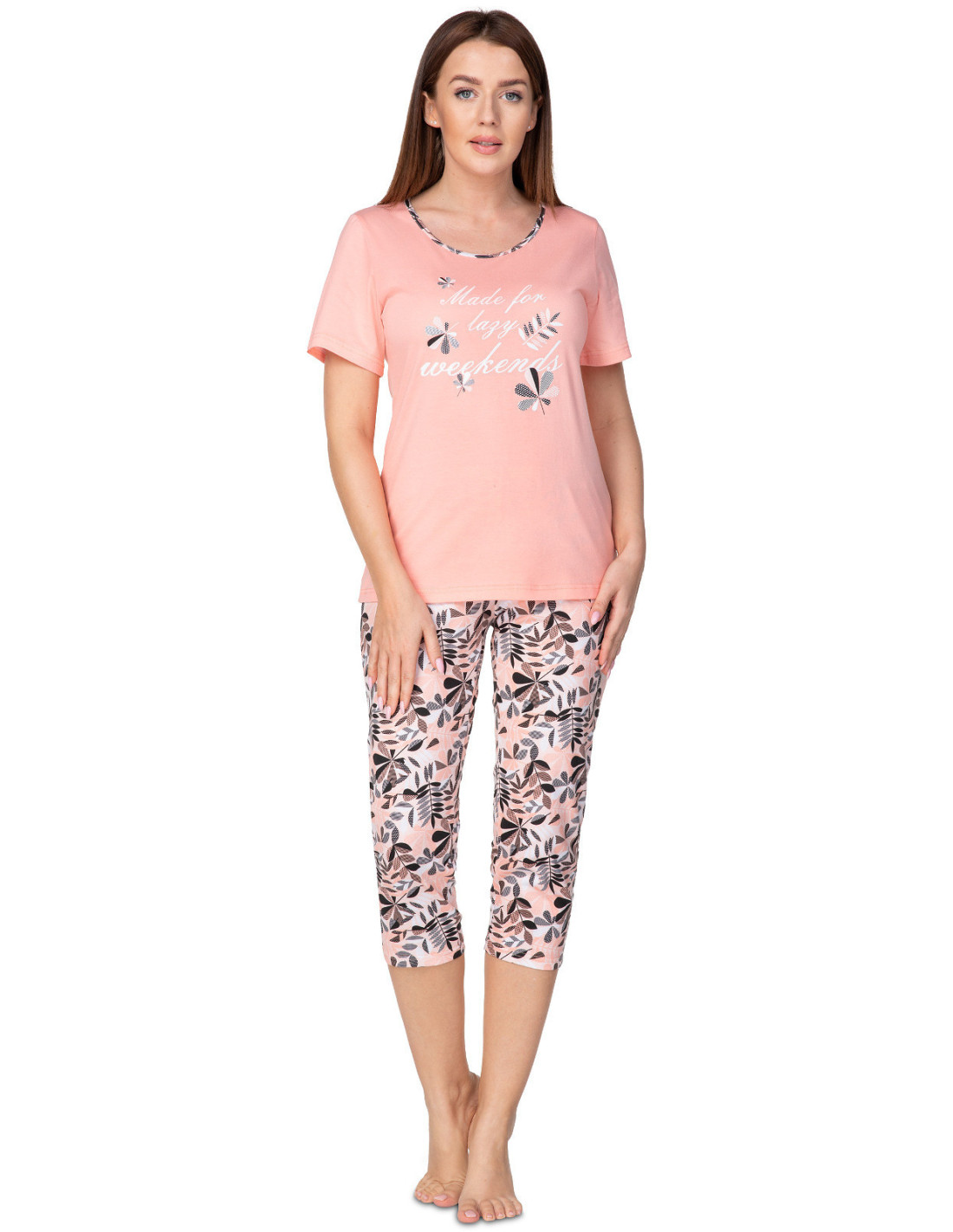 Piżama damska - z wysokiej kokybės bawełny - koszulka z krótkim rękawem - na wysokości piersi ozdobny nadruk - do kompletu wzorzyste spodnie tipo rybaczki