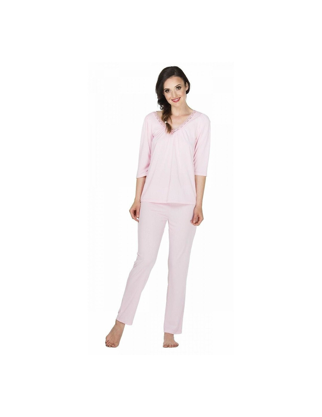 Piżama damska - miękka i przyjemna dla ciała wiskoza - koszulka z rękawem 3/4 - dekolt V, obszyty ażurową koronką - spodnie długie, o prostym kroju - pakowana w pudełko