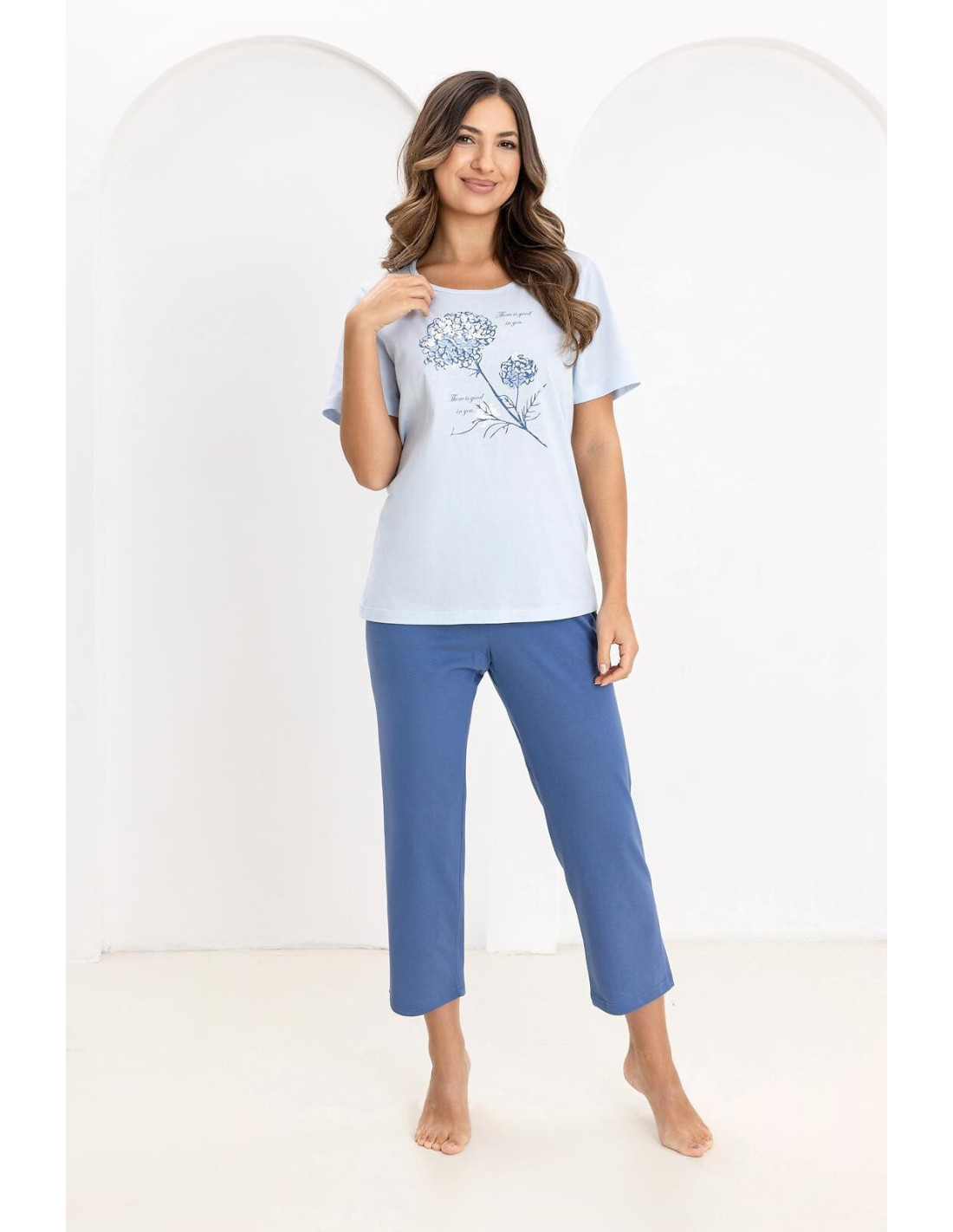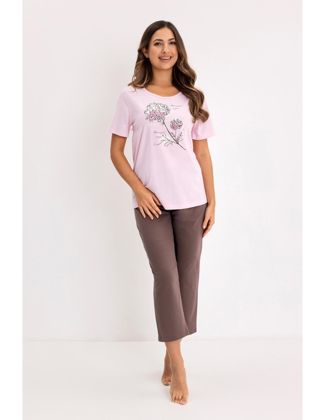 Bawełniana piżama damska - jednolita koszulka - krótki rękaw - półokrągły dekolt - przód ozdobiony nadrukiem - jednolite spodnie, długość 7/8