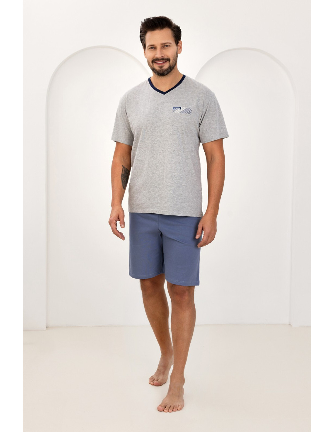 Bawełniana piżama męska - koszulka z krótkim rękawem - dekolt w szpic - krótkie, jednolite spodenki - w pasie gumka obszyta bawełną