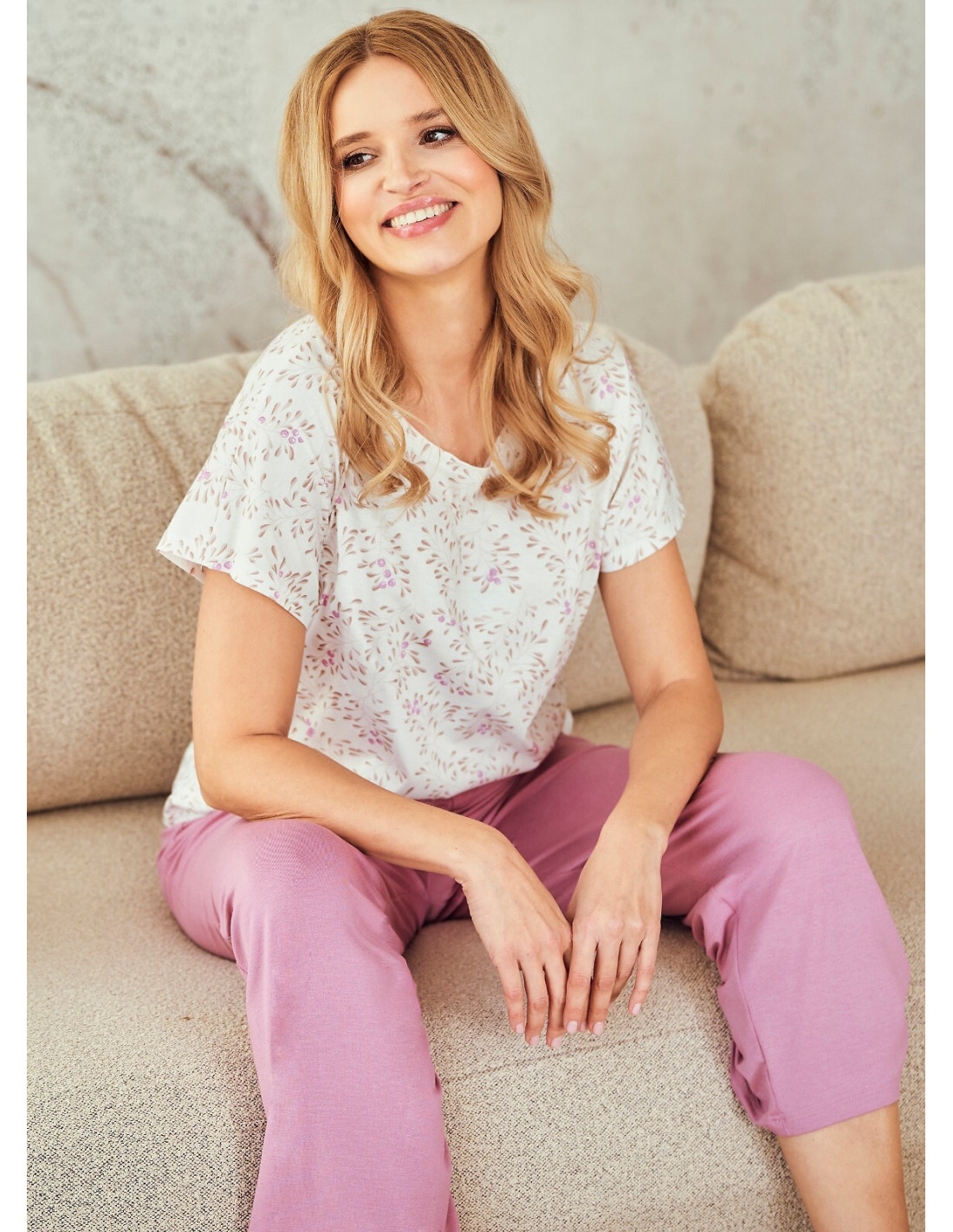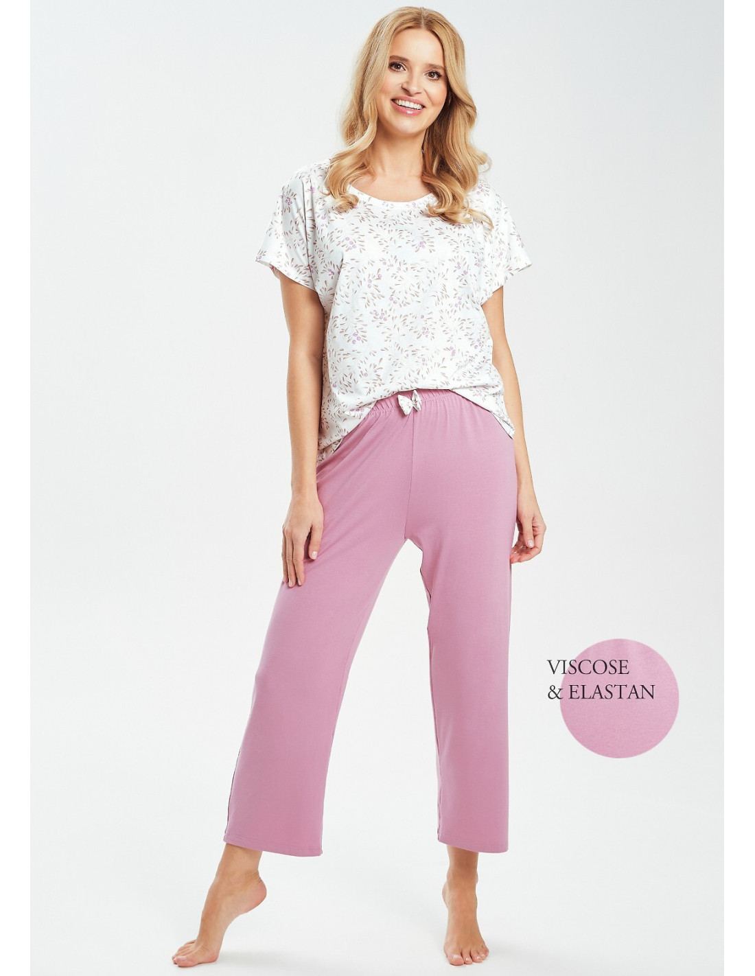 Piżama damska - bawełniana koszulka z krótkim rękawem - roślinny print - dekolt okrągły - apatnie jednolite, z wiskozy, długość 7/8 - w pasie gumka z ozdobną kokardką - pakowana w foliowy worek