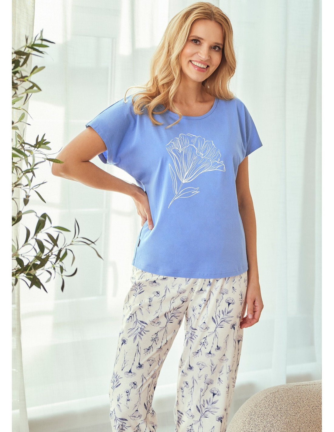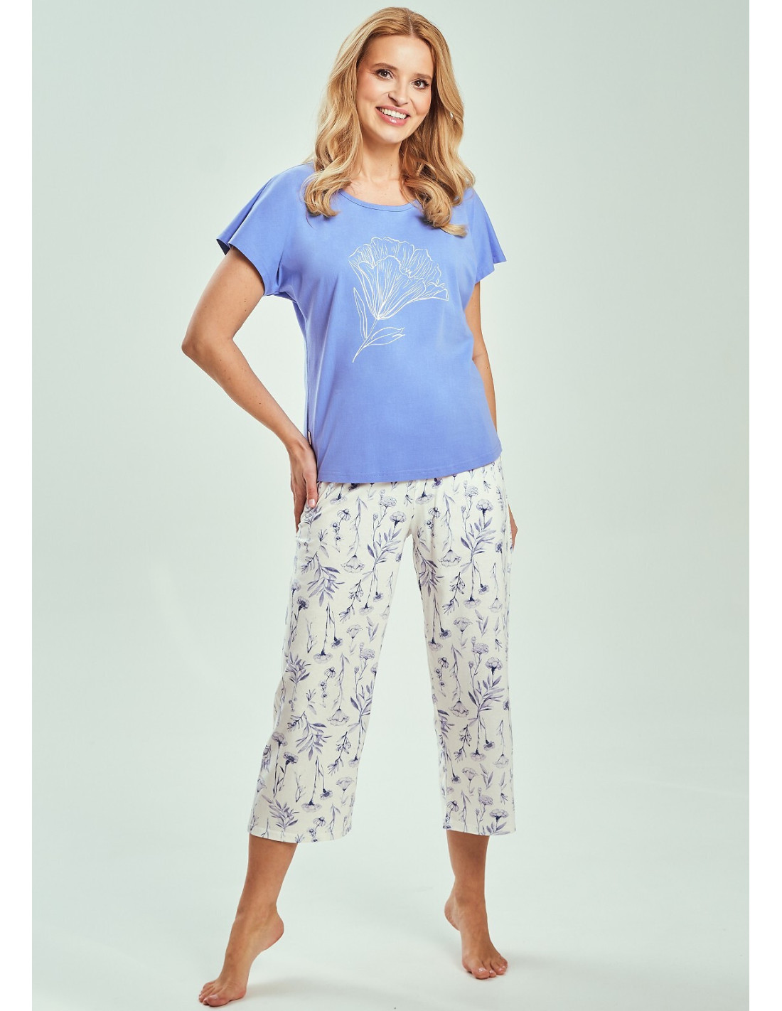 Bawełniana piżama damska - koszulka z krótkim rękawem - z przodu ozdobny nadruk - dekolt półokrągły - spodnie tipo rybaczki z roślinnym printem - w pasie gumka obszyta bawełną - pakowana w foliowy worek