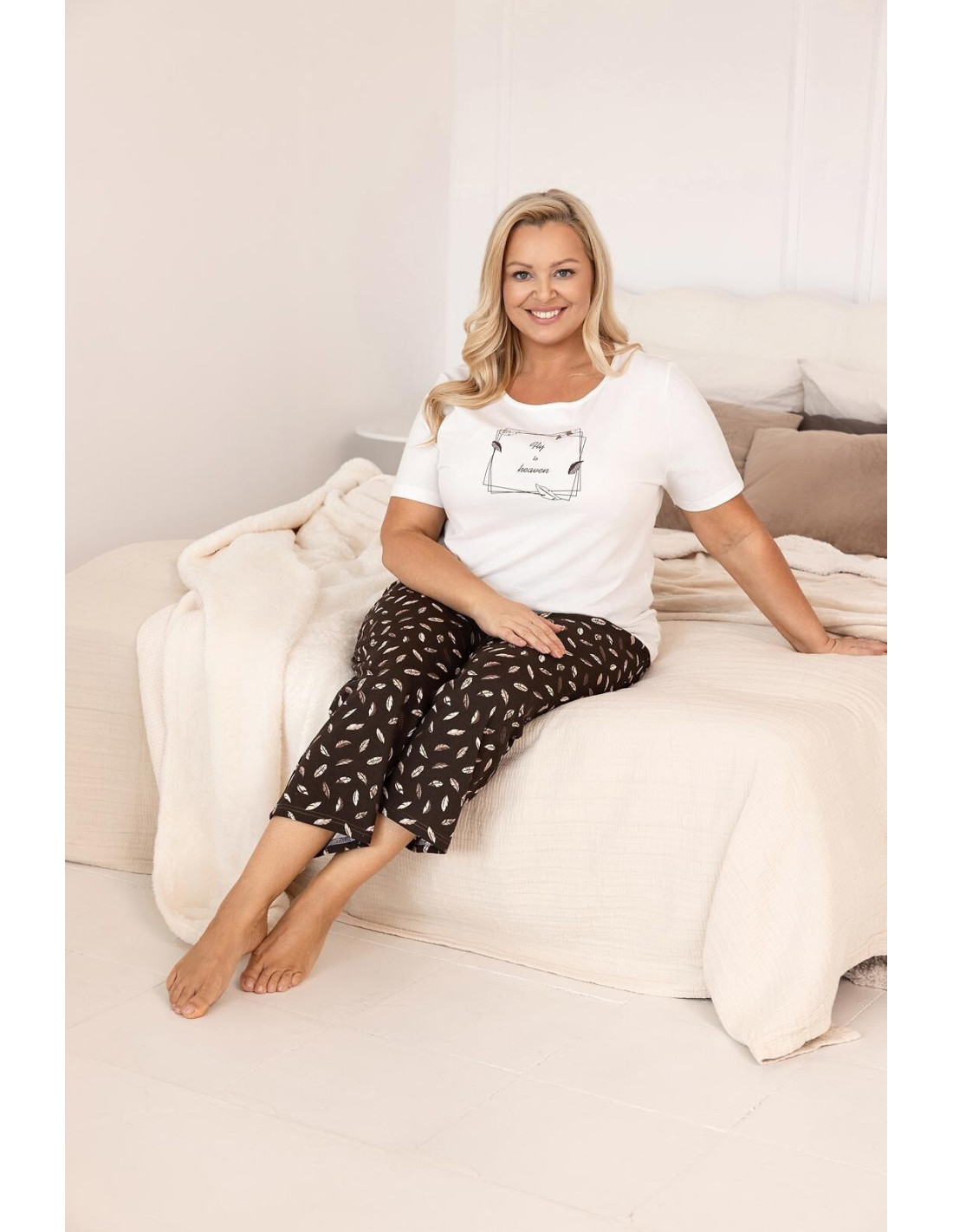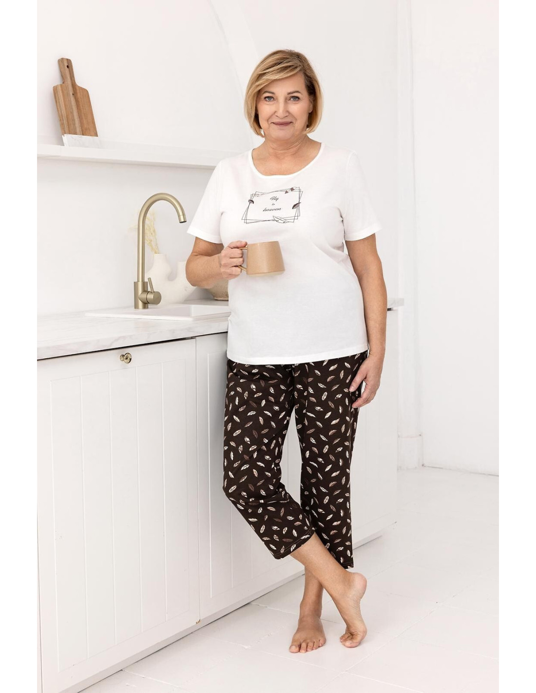 Bawełniana piżama damska - koszulka z krótkim rękawem - dekolt półokrągły - z przodu ozdobny nadruk - wzorzyste apatnie o długości 7/8 - w pasie gumka obszyta bawełną