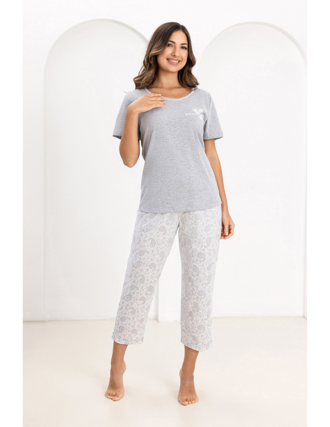 Bawełniana piżama damska - koszulka z krótkim rękawem - dekolt półokrągły - z przodu ozdobny nadruk - wzorzyste apatnie o długości 7/8 - w pasie gumka obszyta bawełną