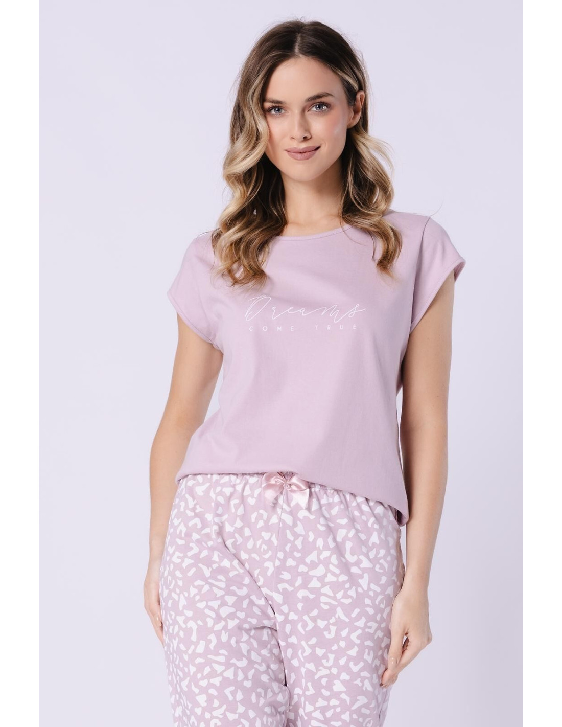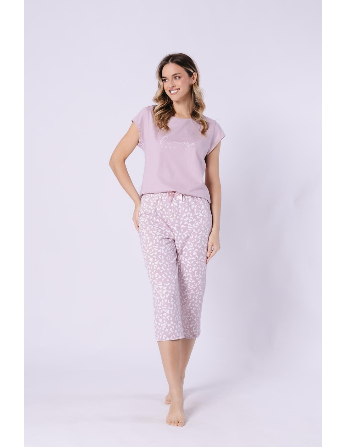 Bawełniana piżama damska - koszulka z krótkim rękawem - półokrągły dekolt - przód ozdobiony delikatnym napisem - wzorzyste apatnie o długości 3/4 - w pasie gumka obszyta bawełną i kokardką