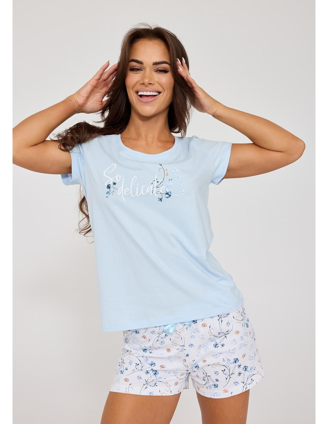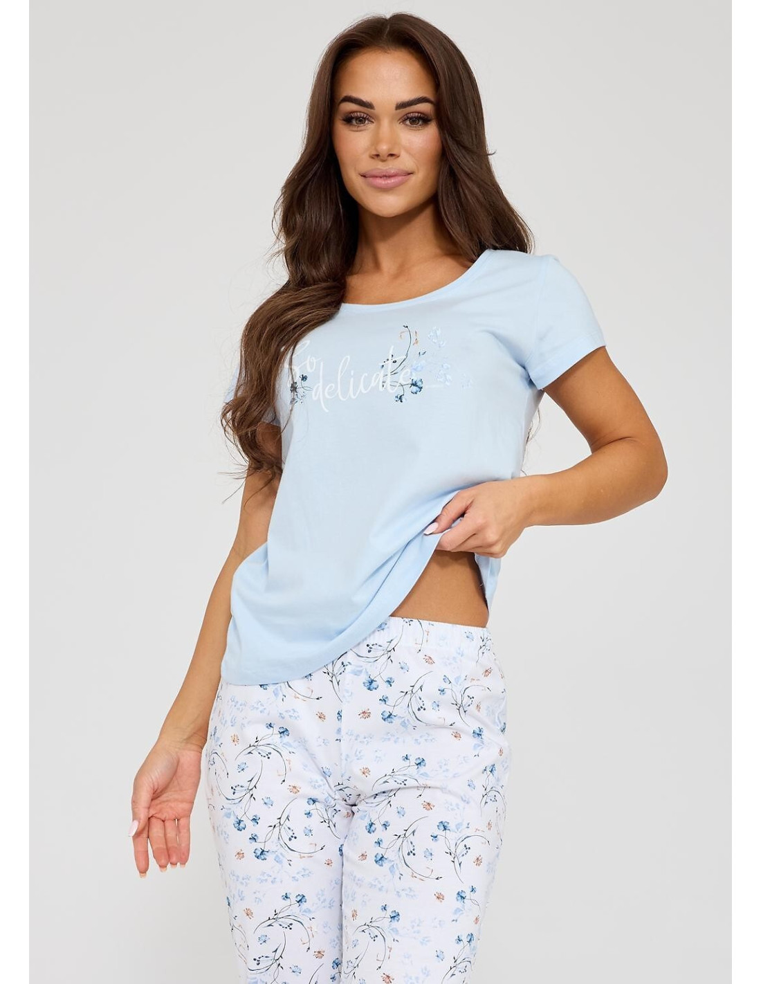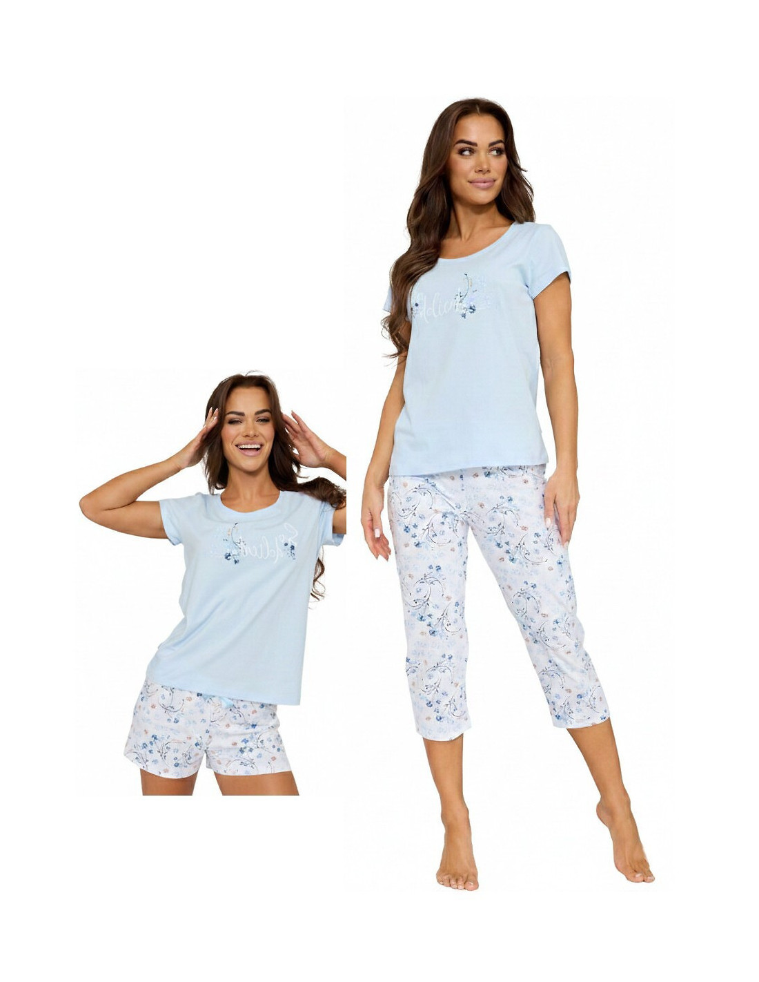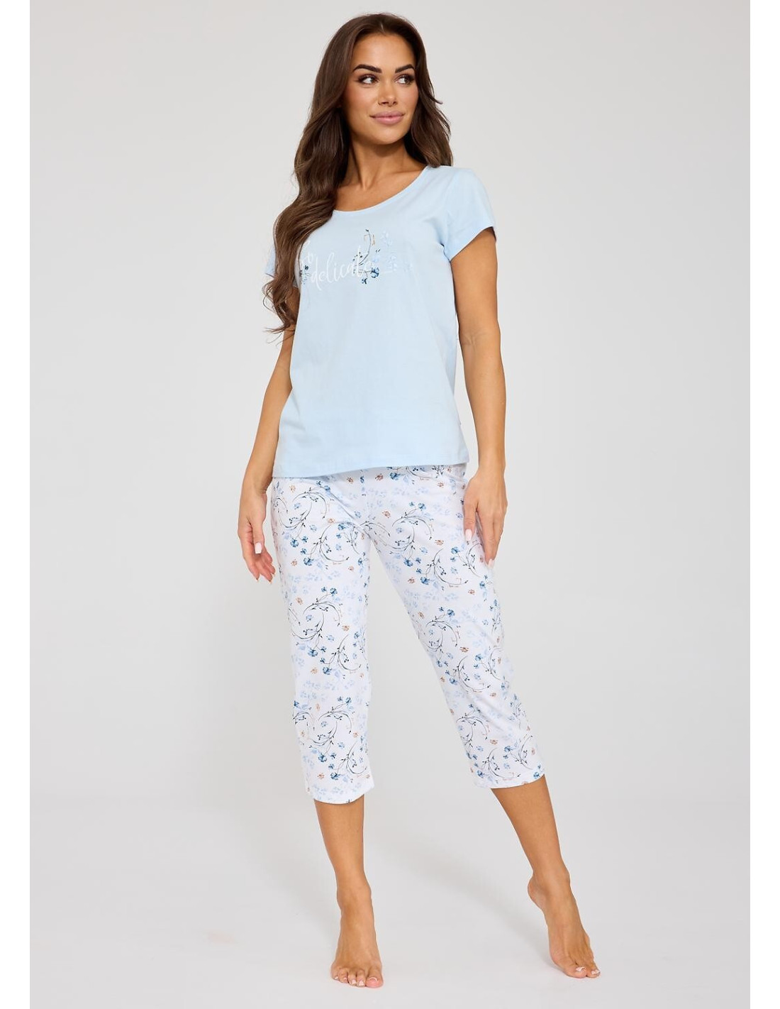 Trzyczęściowa piżama damska - wysoka jakość bawełny - koszulka z krótkim rękawem - na piersi delikatny nadruk - w komplecie dwie pary spodni, krótkie i rybaczki - wzór w kwiatuszki - w pasie satynowa kokardka - pakowana w pudełko
