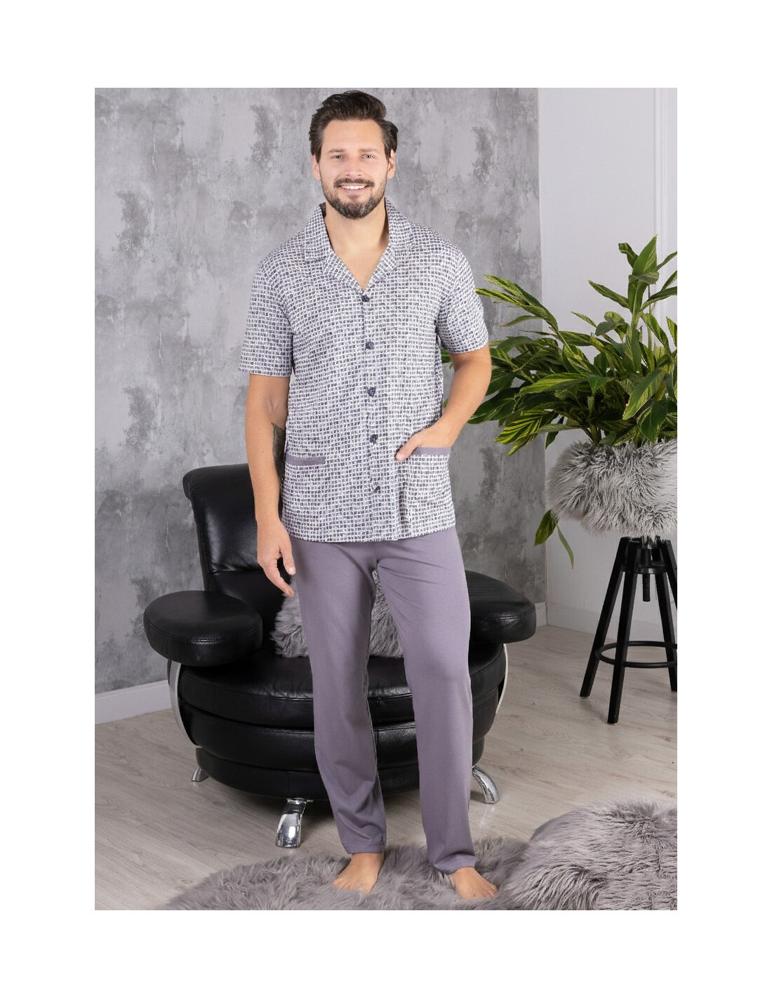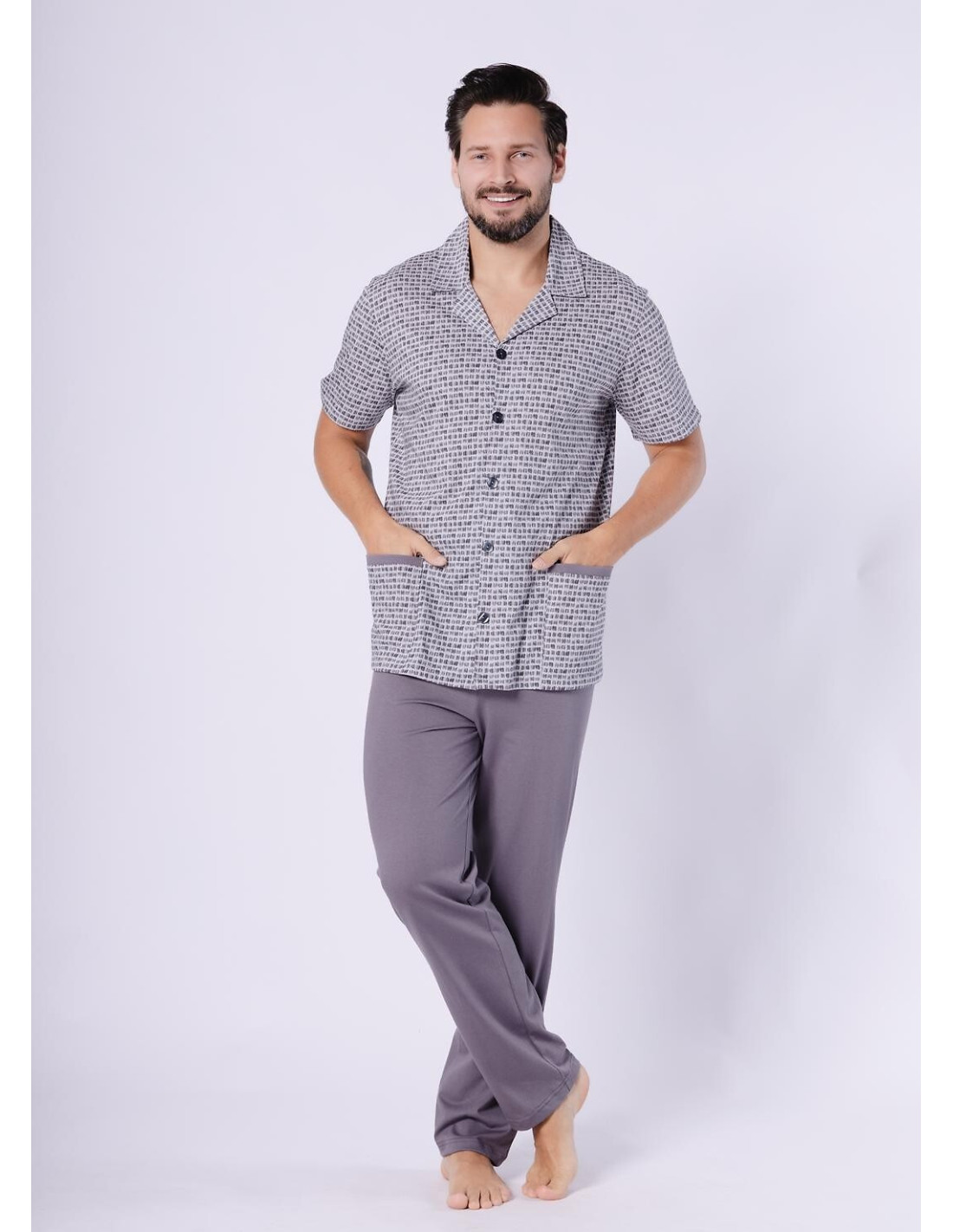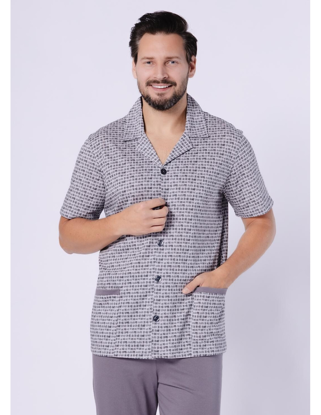 Piżama męska, rozpinana - wysoka jakość bawełny - bluza wzorzysta, zapinana na guziki - krótki rękaw - z kołnierzykiem, z kieszeniami - spodnie długie, jednolite