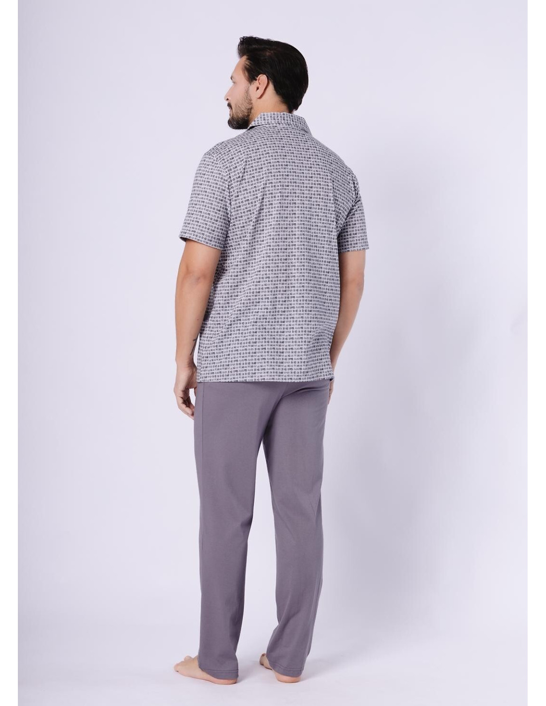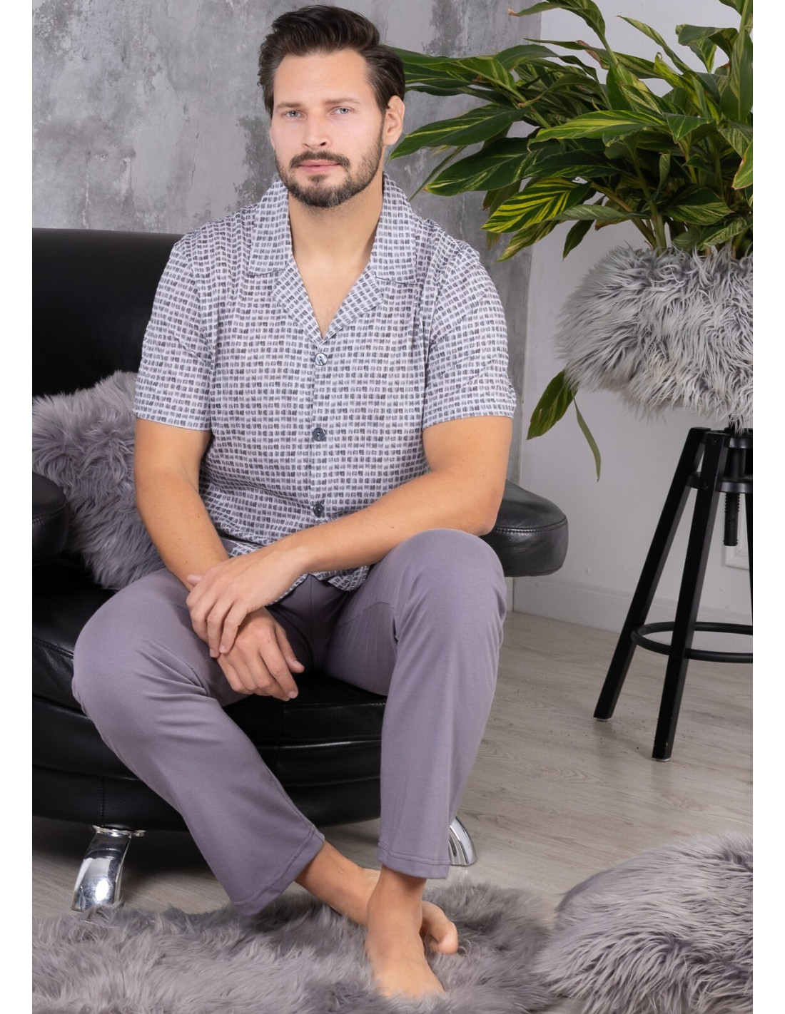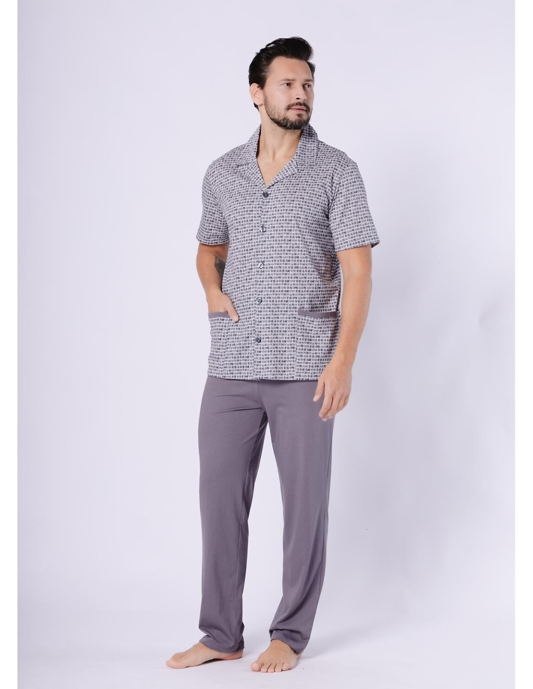 Piżama męska, rozpinana - wysoka jakość bawełny - bluza wzorzysta, zapinana na guziki - krótki rękaw - z kołnierzykiem, z kieszeniami - spodnie długie, jednolite
