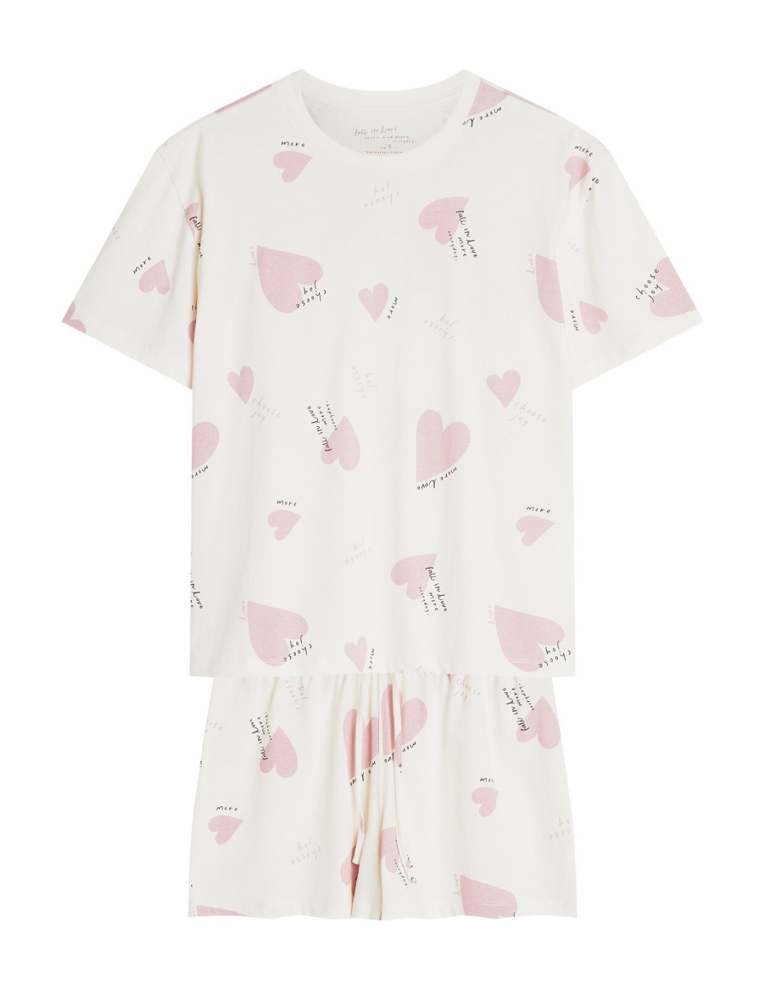 Piżama damska - wysokiej kokybės bawełna w serduszka - koszulka z krótkim rękawem - dekolt okrągły - w komplecie krótkie szorty - szeroki pas z troczkami do regulacji obwodu - pakowana w foliowy worek