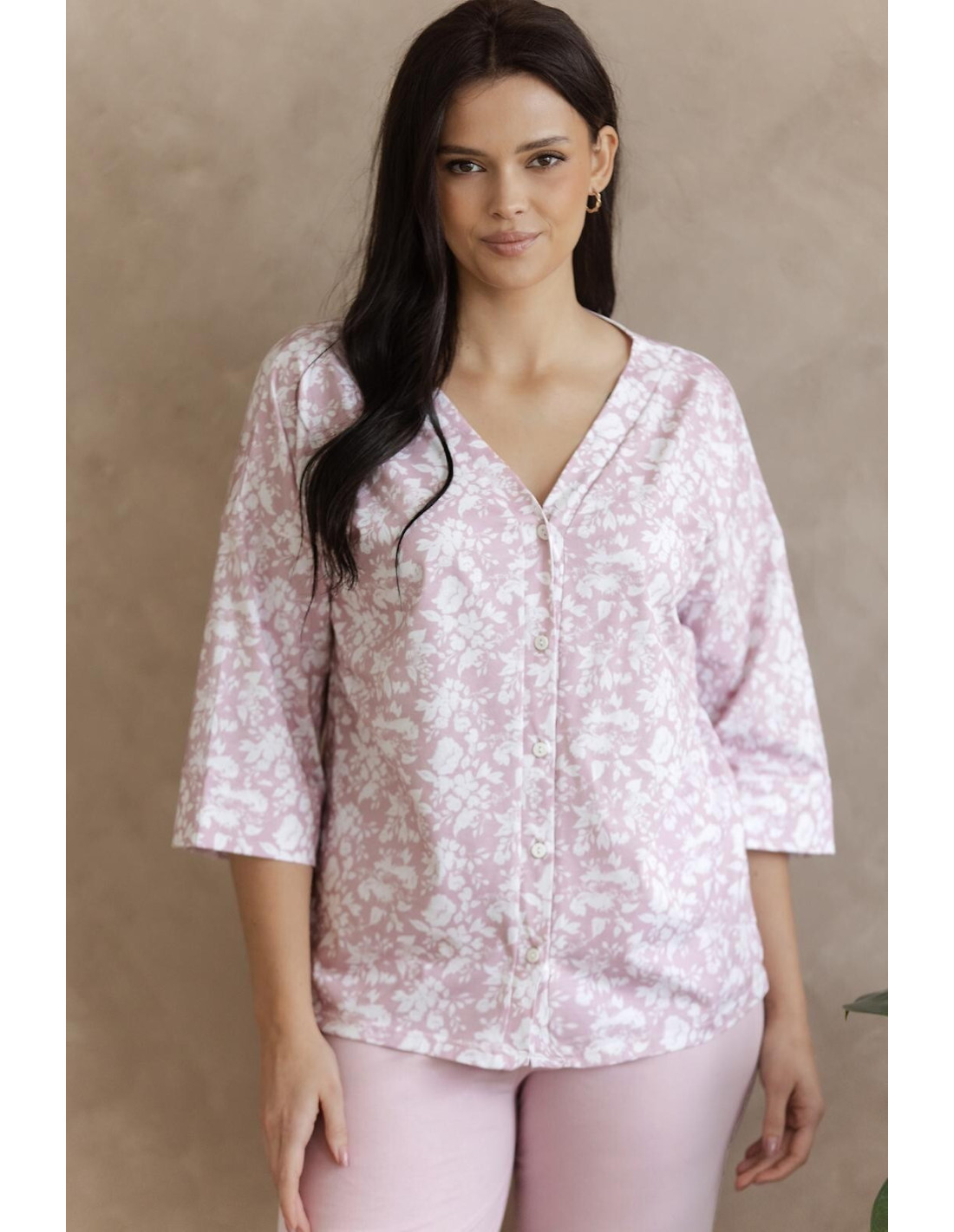 Piżama damska - wysokiej jakości delikatna bawełna w kwiatki - bluza z rękawem 3/4 - zapinana na guziki - spodnie długie o luźnym kroju - pakowana w foliowy woreczek