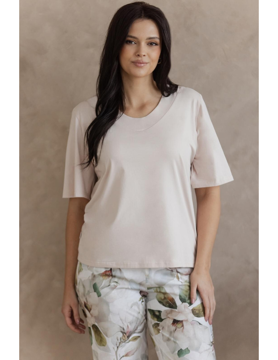 Bawełniana piżama damska - koszulka jednolita - rękaw do łokcia lekko falowany - większy dekolt - spodnie z nogawką 7/8 - print w kolorowe kwiaty - w pasie gumka obszyta bawełną