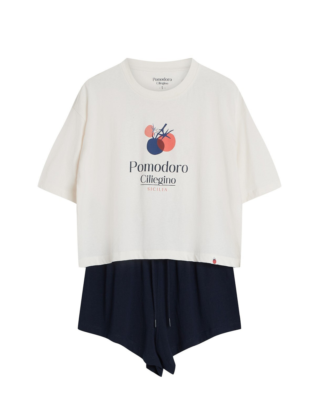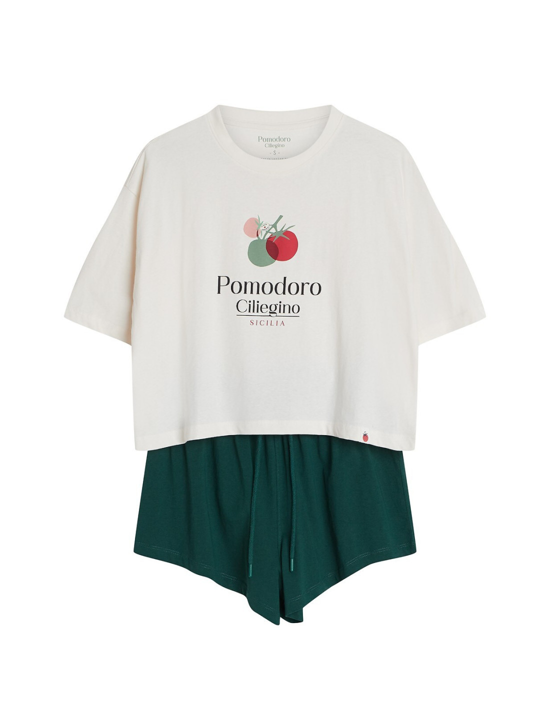 Piżama damska - aukštos kokybės bawełna - ozdobiona printem z pomidorem - krótszy fason koszulki - krótki rękaw - dekolt okrągły - w komplecie krótkie szorty - szeroki pas z troczkami do regulacji obwodu - pakowana w foliowy worek
