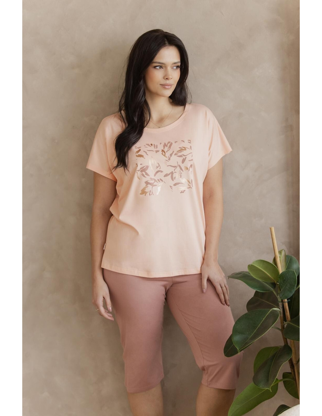 Bawełniana piżama damska - koszulka z krótkim rękawem - półokrągły dekolt - wzorzyste apatnie o długości 7/8 - w pasie gumka obszyta bawełną i satynową kokardką