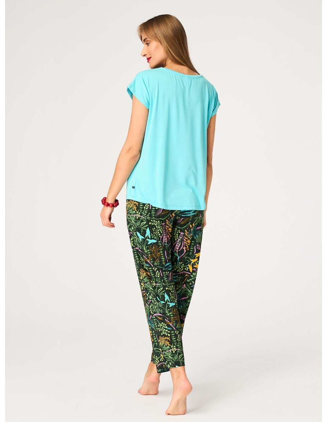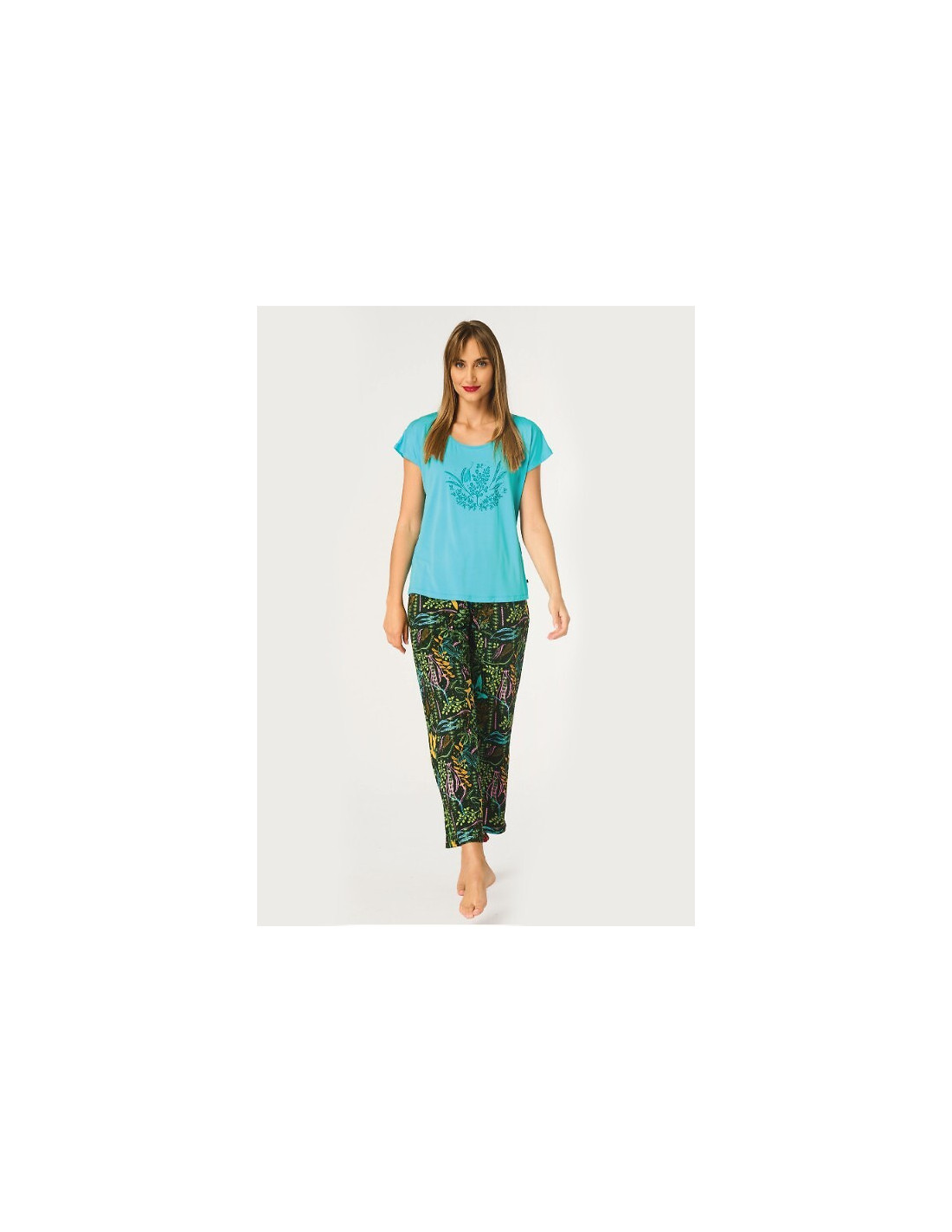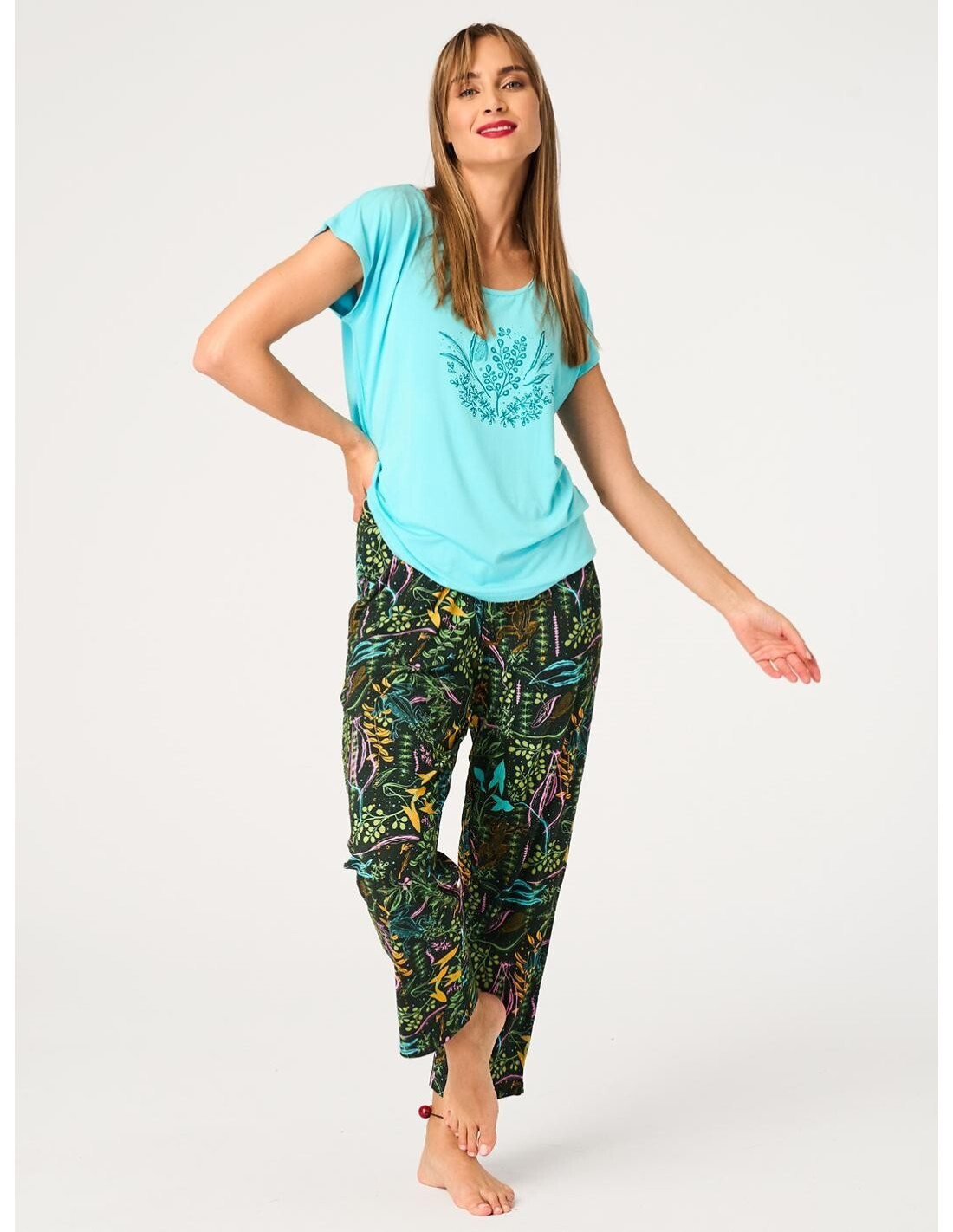 Piżama damska - wysokiej kokybės wiskoza - koszulka z krótkim rękawem - półokrągły dekolt - przód ozdobiony delikatnym roślinnym nadrukiem - do kompletu kolorowe spodnie, długość 7/8 - pas obszyty bawełną - pakowana w foliowy woreczek