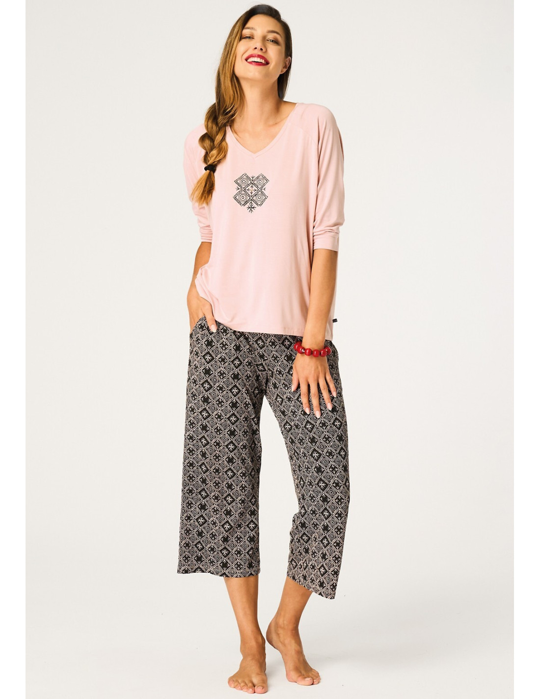 Piżama damska - wysokiej kokybės wiskoza - koszulka z rękawem 3/4 - dekolt "V" - przód ozdobiony delikatnym nadrukiem z połyskującym diamencikiem - do kompletu wzorzyste spodnie, długość 3/4 - luźny, wygodny fason - na biodrach kieszenie - pakowana w foliowy woreczek