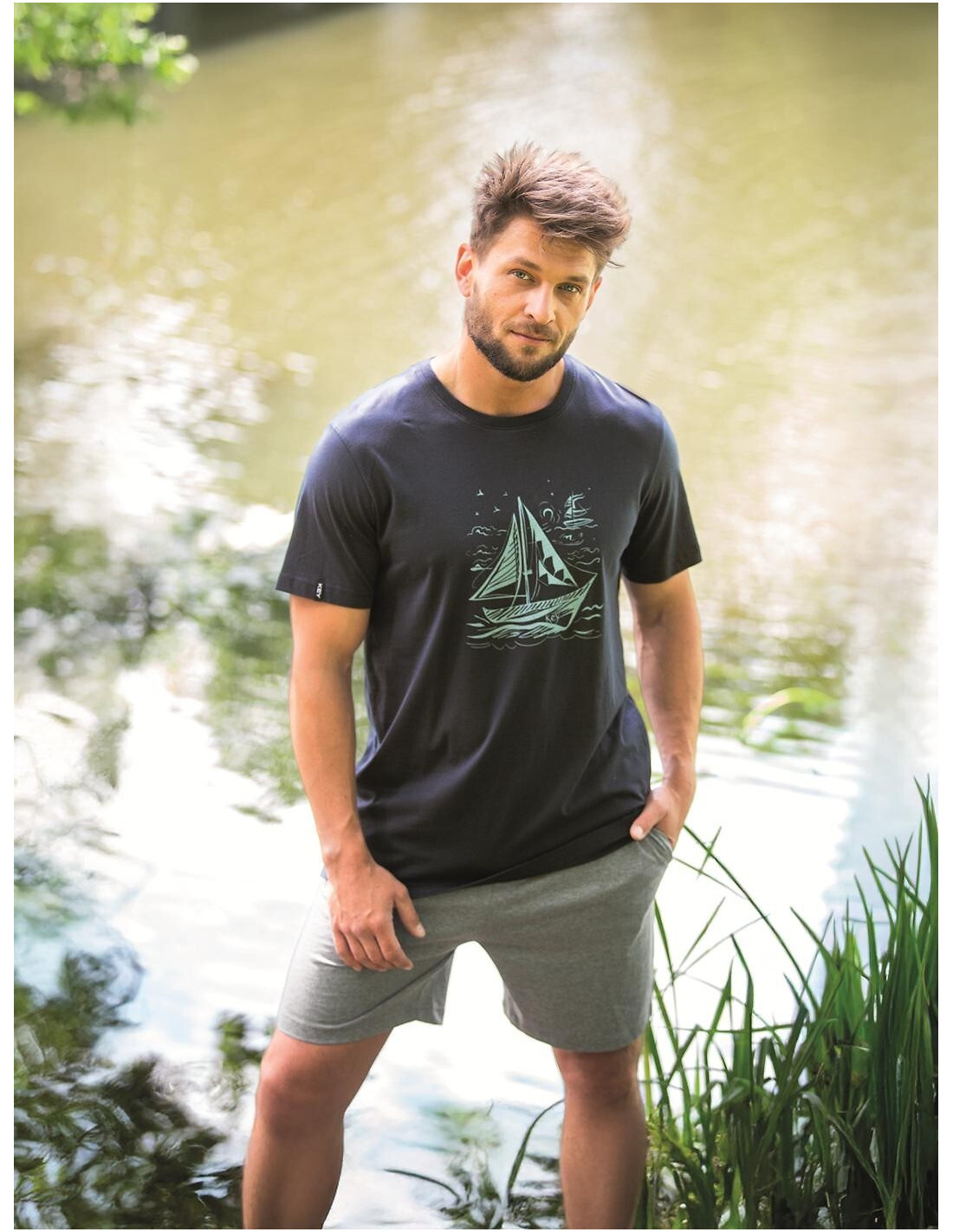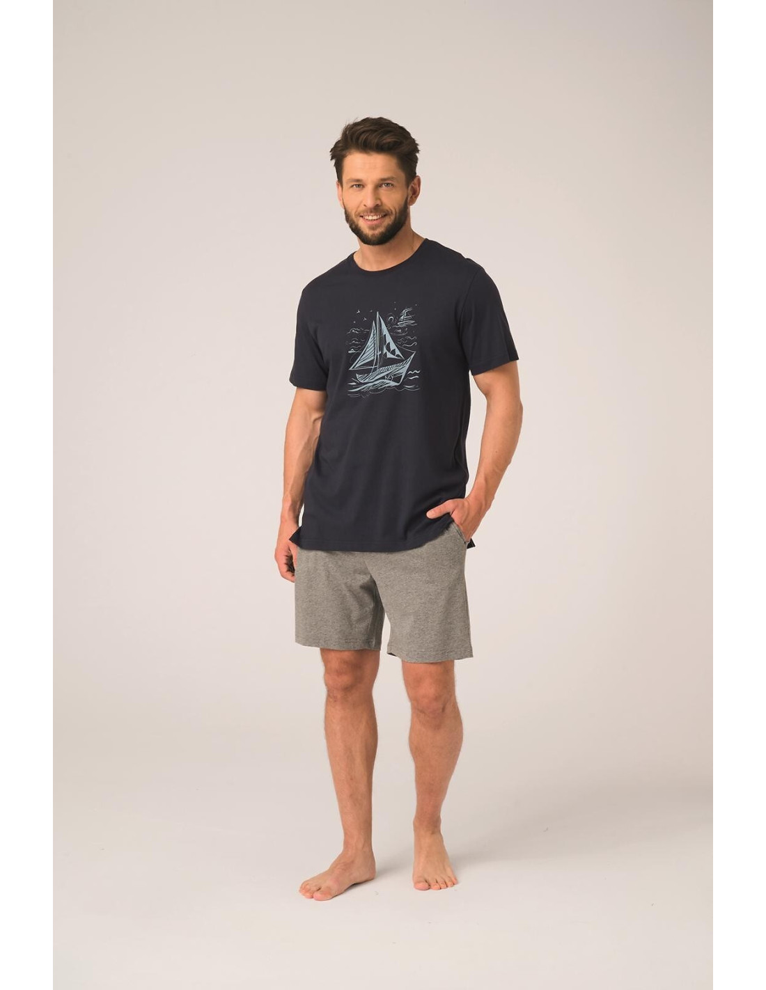 Piżama męska - z wysokiej kokybės bawełny - koszulka z krótkim rękawem - okrągły dekolt - przód z ozdobnym nadrukiem - do kompletu krótkie, melanżowe spodenki - wygodne kieszenie po bokach