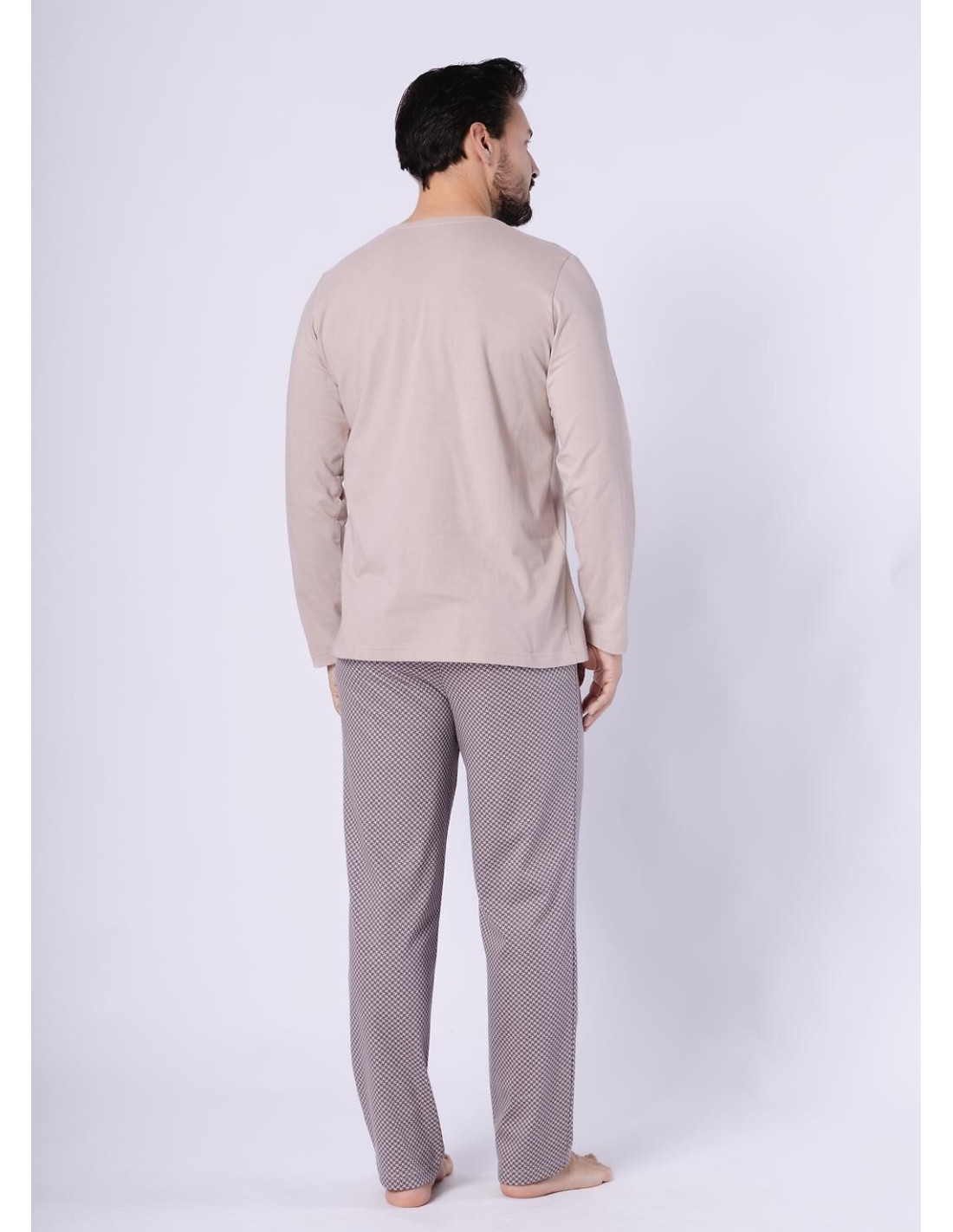 Bawełniana piżama męska - koszulka jednolita, z długim rękawem - dekolt w szpic - na piersi naszyta kieszonka - spodnie długie, wzorzyste - w pasie gumka obszyta bawełną