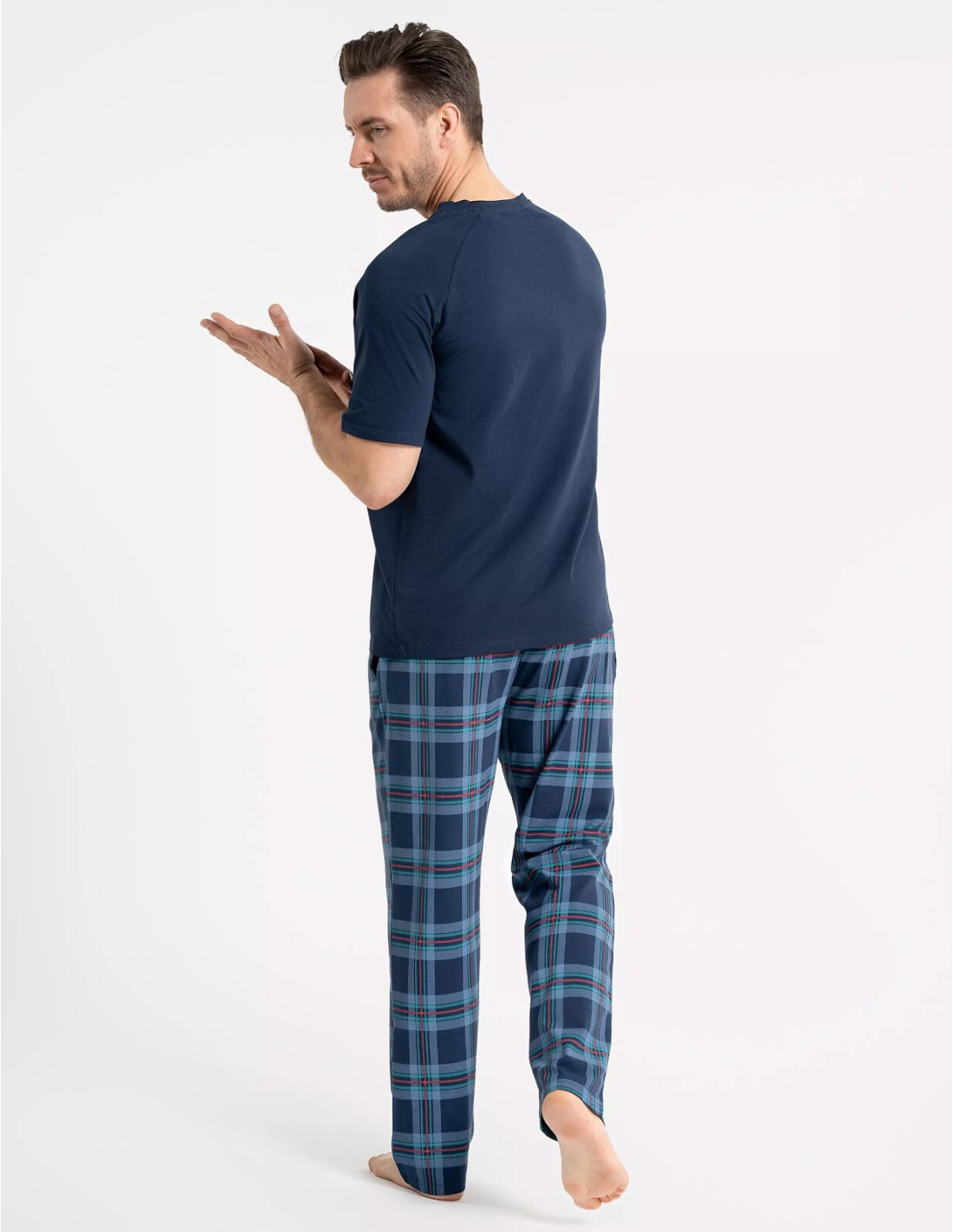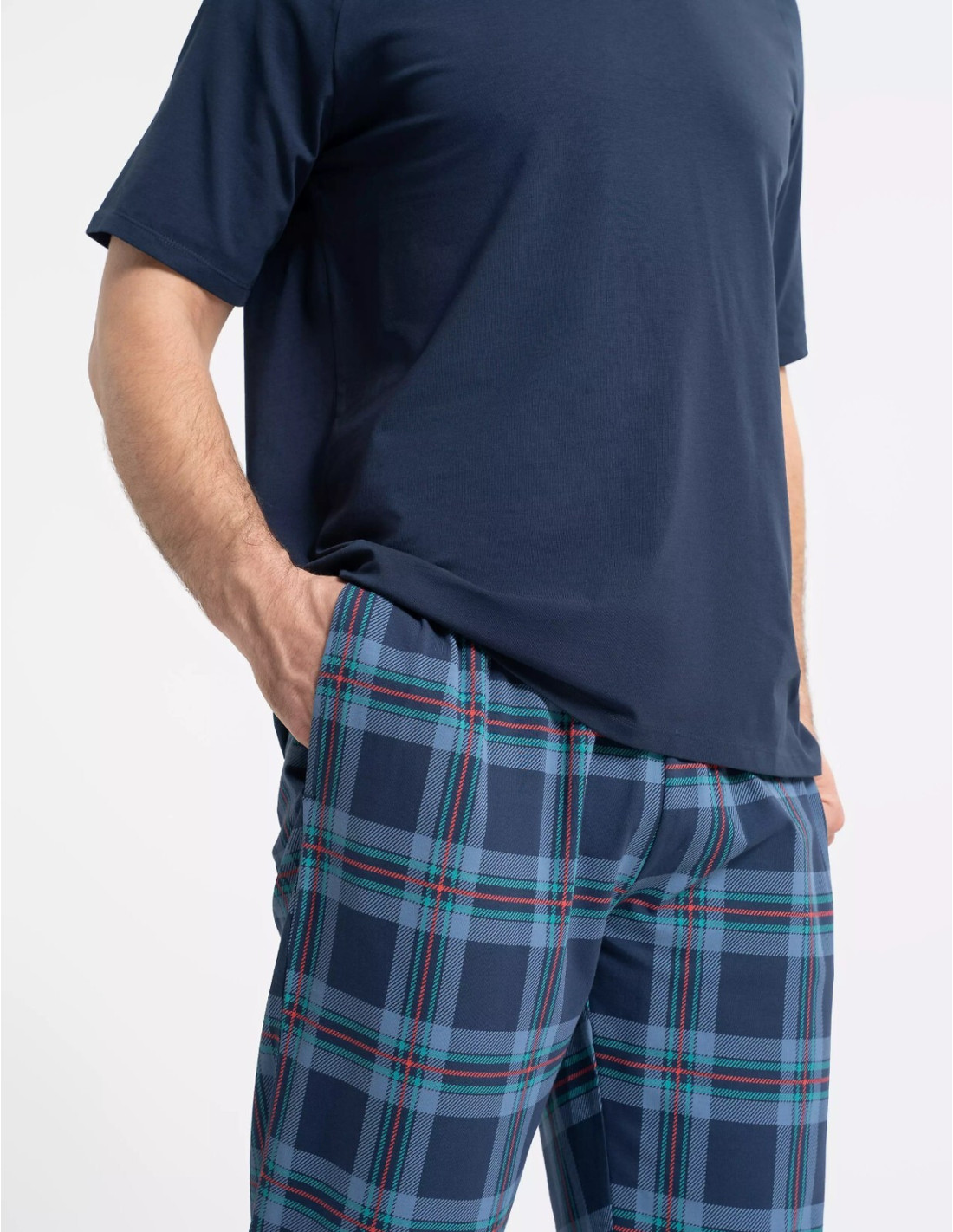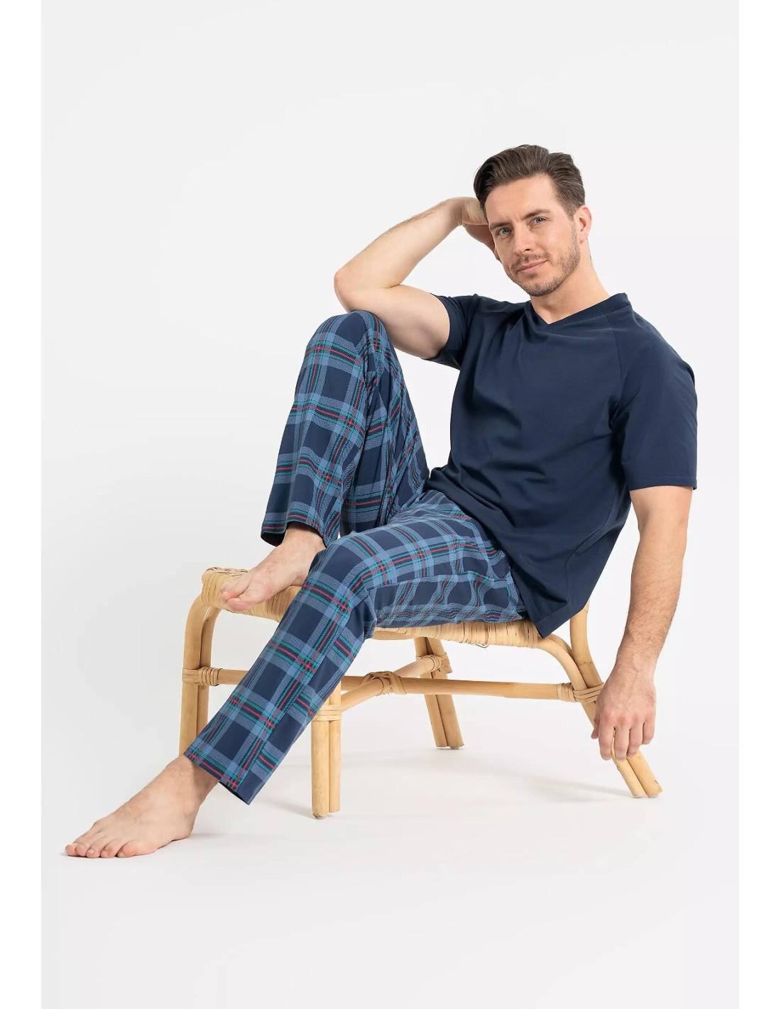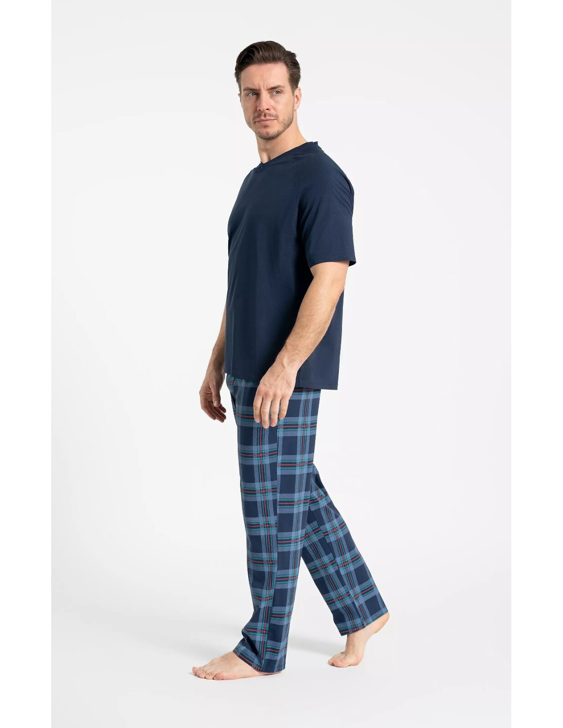 Piżama męska - wysokiej kokybės bawełna - jednolita koszulka z krótkim rękawem - dekolt w kształcie litery "V" - długie spodnie w kratkę - w pasie wygodna gumka - na biodrach kieszenie - pakowana w foliowy worek