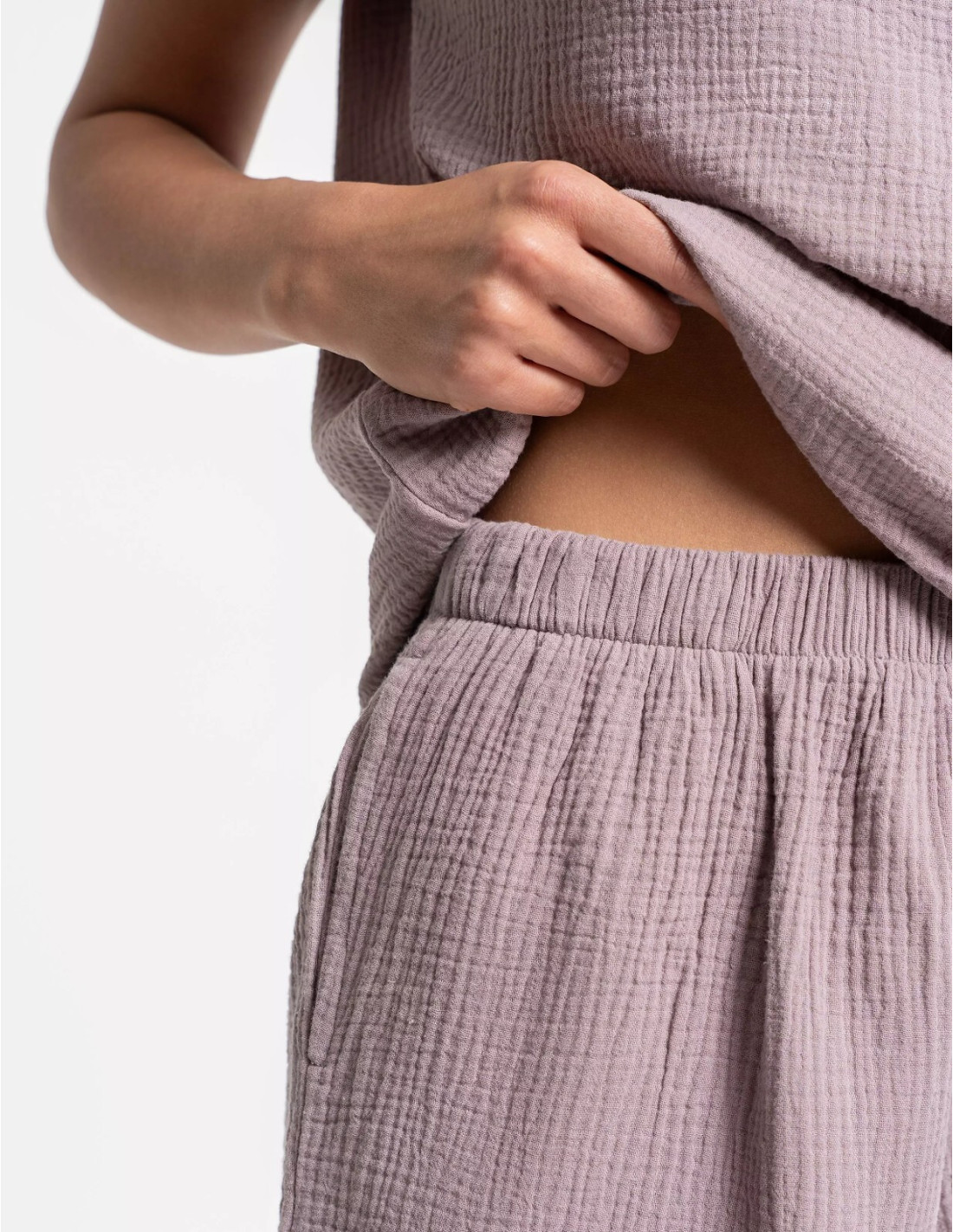 Piżama damska - przyjemna dla ciała bawełna tipo muślin - luźna koszulka z krótkim rękawem - półokrągły dekolt - w komplecie krótkie luźne spodenki - w pasie gumka - na wysokości bioder wygodne kieszenie