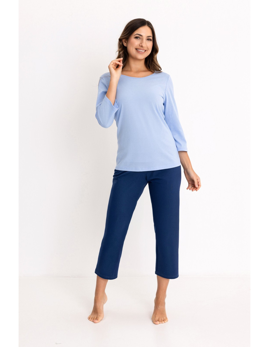 Bawełniana piżama damska - koszulka z rękawem 3/4 - dekolt półokrągły - jednolite spodnie o długości 7/8 - w pasie gumka obszyta bawełną