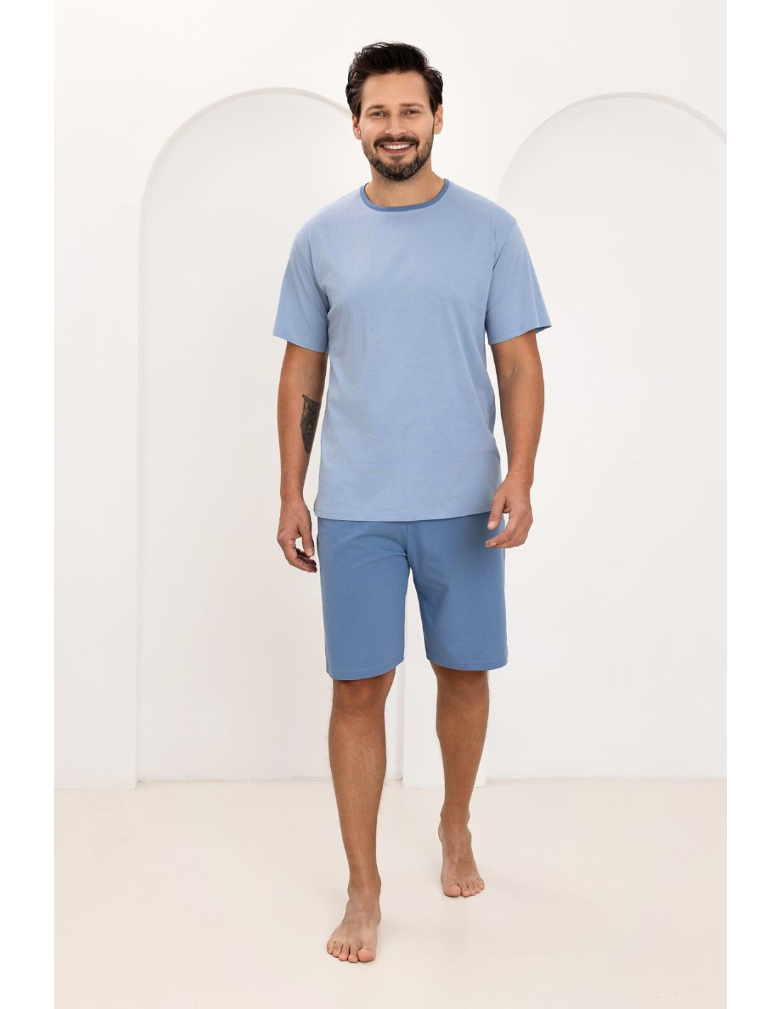 Bawełniana piżama męska - koszulka z krótkim rękawem - dekolt okrągły - krótkie, jednolite spodenki - w pasie gumka obszyta bawełną
