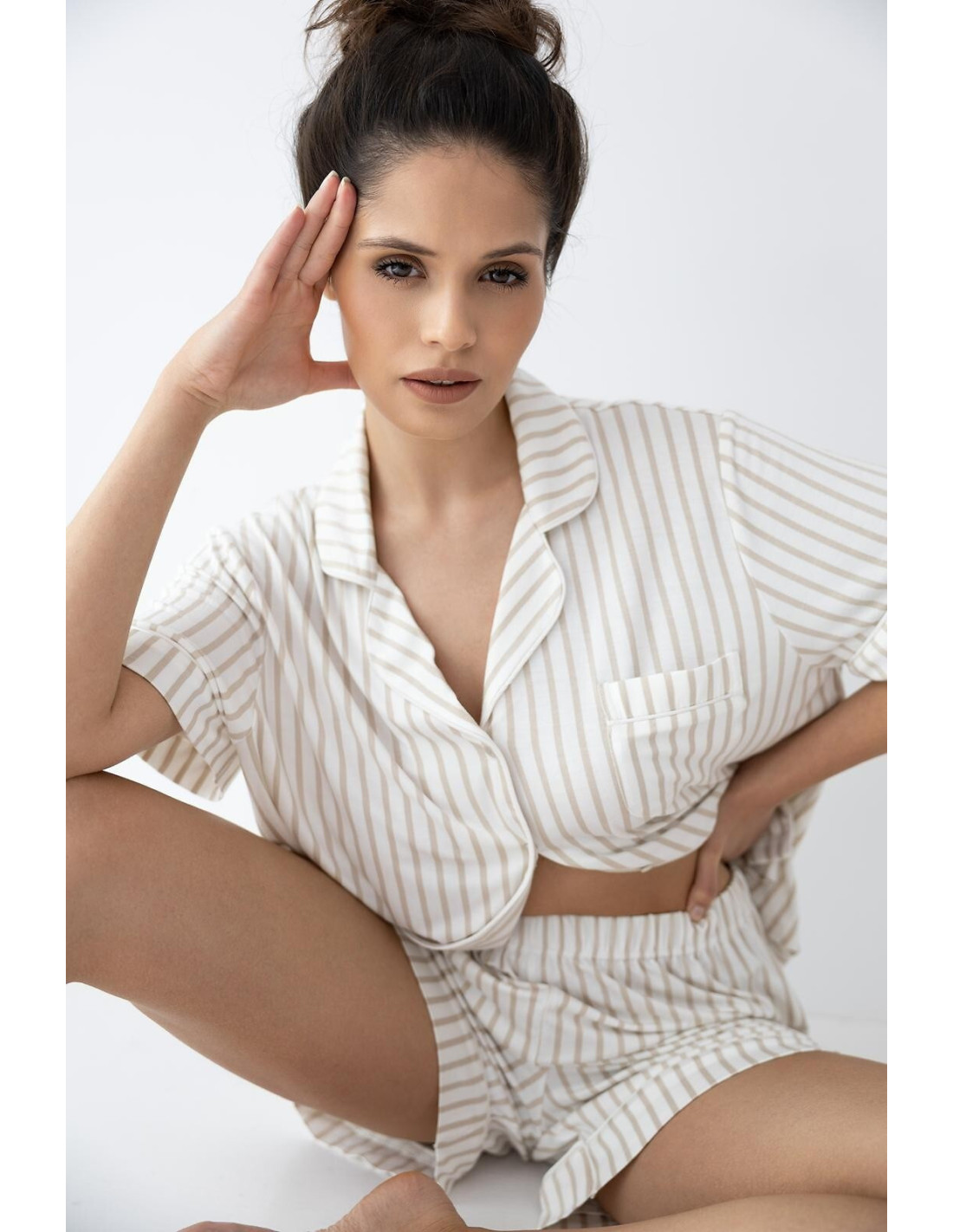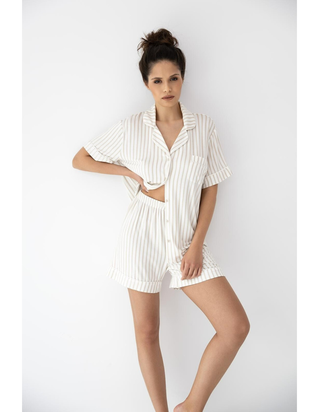 Piżama damska - wysokiej kokybės wiskoza - print w paski - koszulka z krótkim rękawem - z kołnierzykiem, zapinana na guziki - na piersi naszyta kieszonka - spodenki krótkie - w pasie gumka obszyta dzianiną