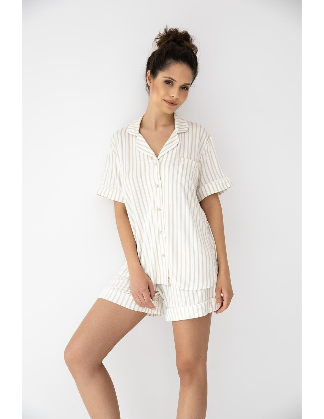 Piżama damska - wysokiej kokybės wiskoza - print w paski - koszulka z krótkim rękawem - z kołnierzykiem, zapinana na guziki - na piersi naszyta kieszonka - spodenki krótkie - w pasie gumka obszyta dzianiną