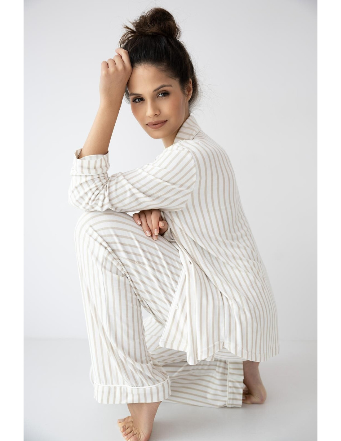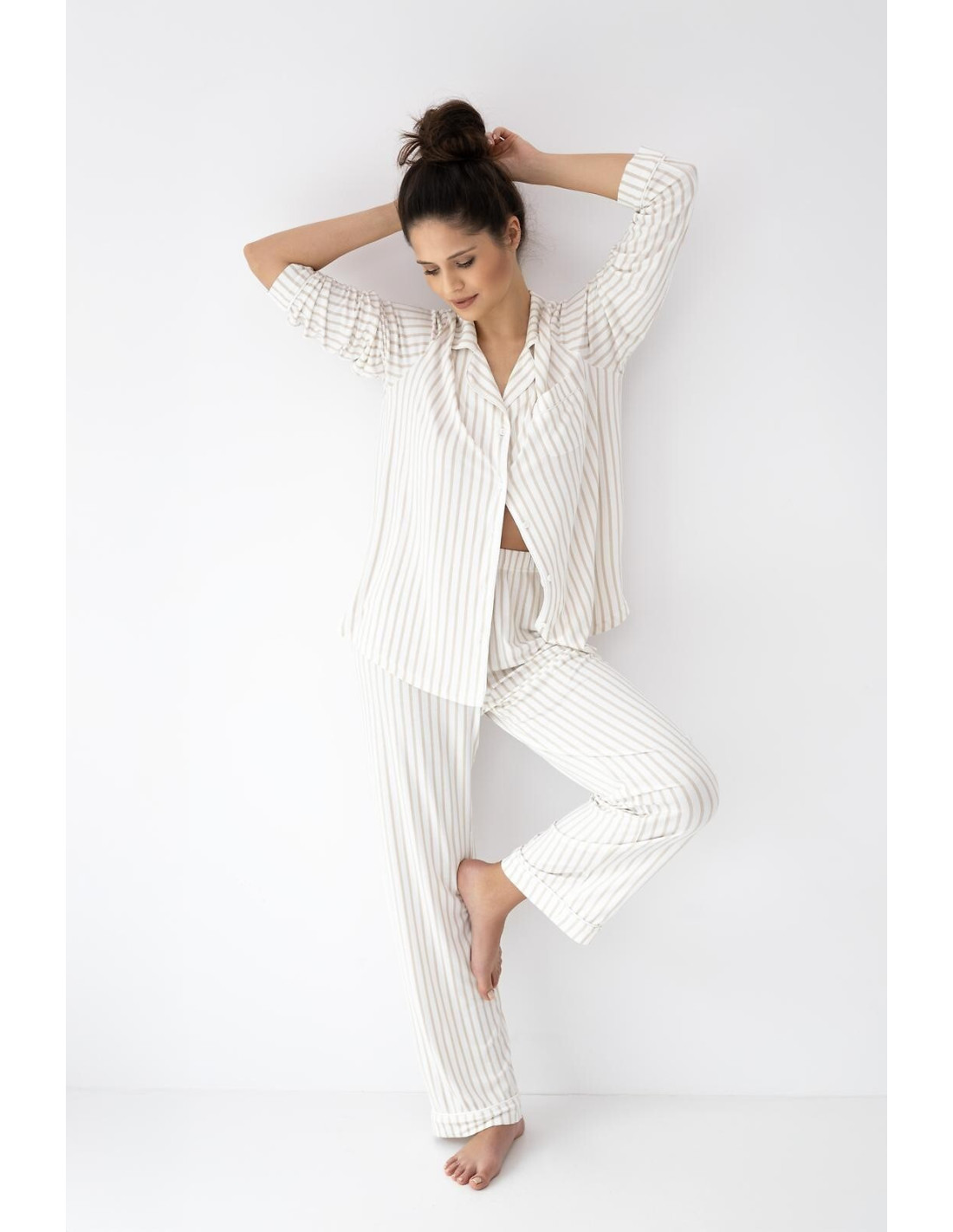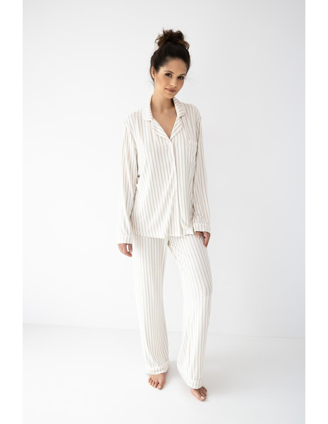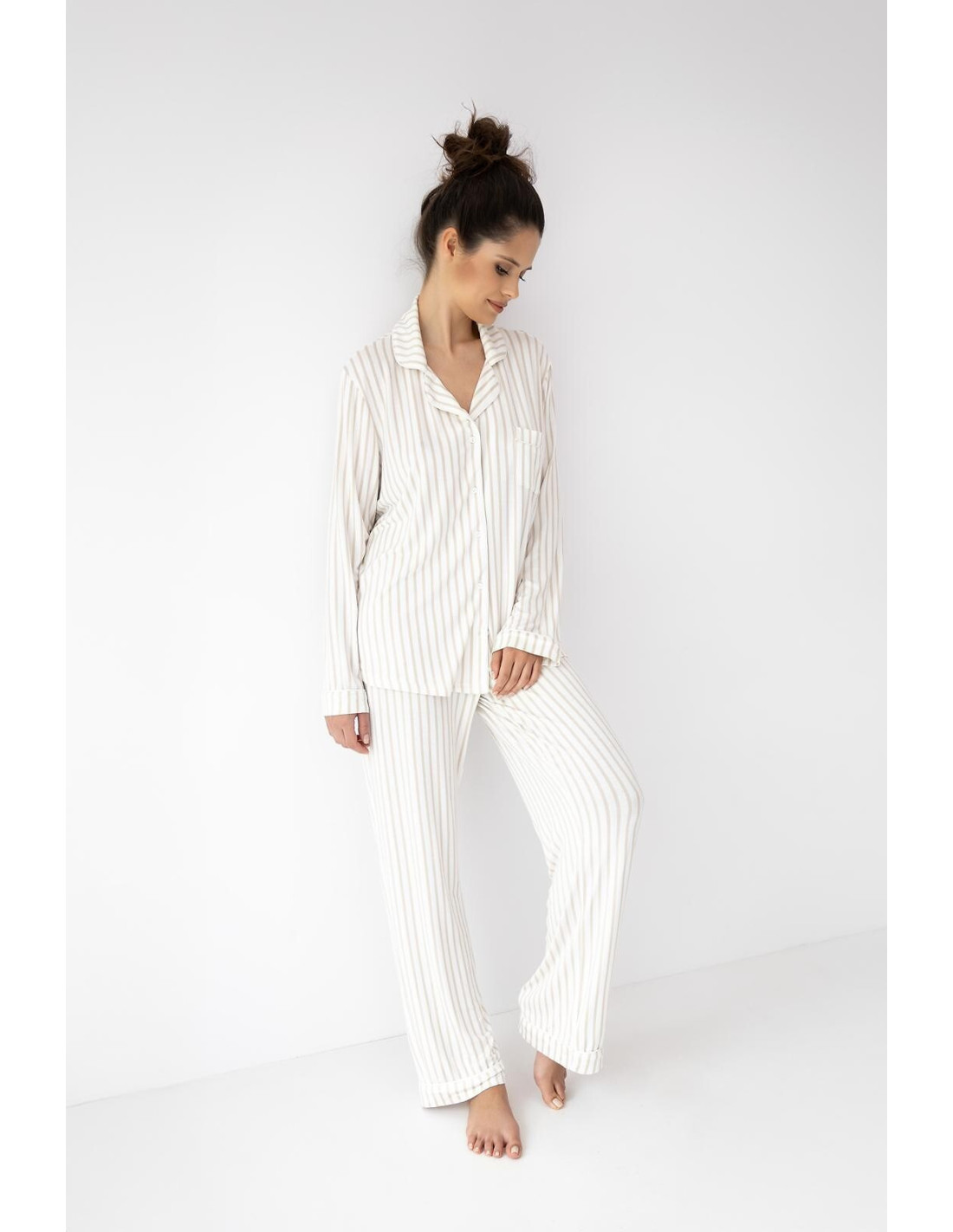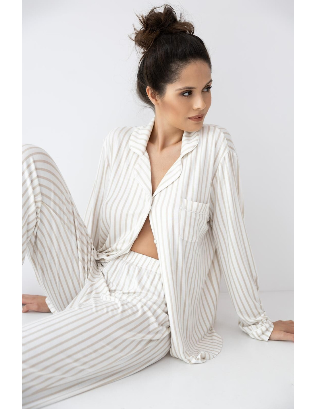 Piżama damska - wysokiej kokybės wiskoza - print w paski - koszulka z długim rękawem - z kołnierzykiem, zapinana na guziki - na piersi naszyta kieszonka - długie proste spodnie - w pasie gumka obszyta dzianiną