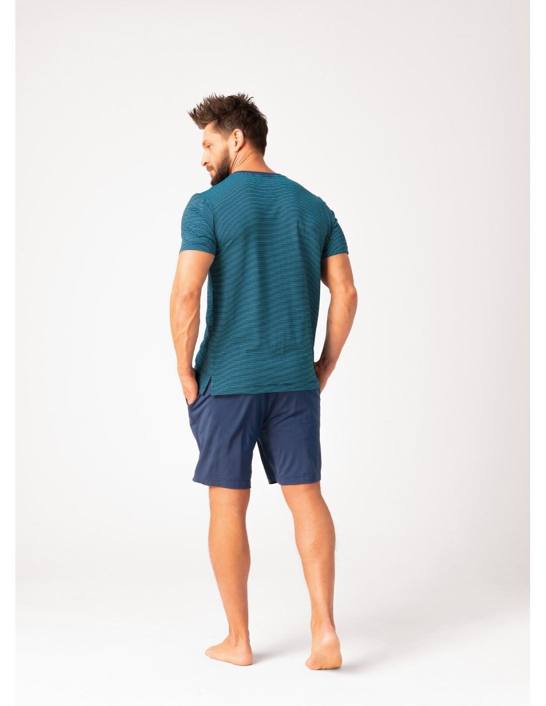 Piżama męska- z wysokiej jakości wiskozy- koszulka z krótkim rękawem- dekolt półokrągły- ozdobiona wzorem w paski- do kompletu krótkie spodenki- wygodne kieszenie po bokach