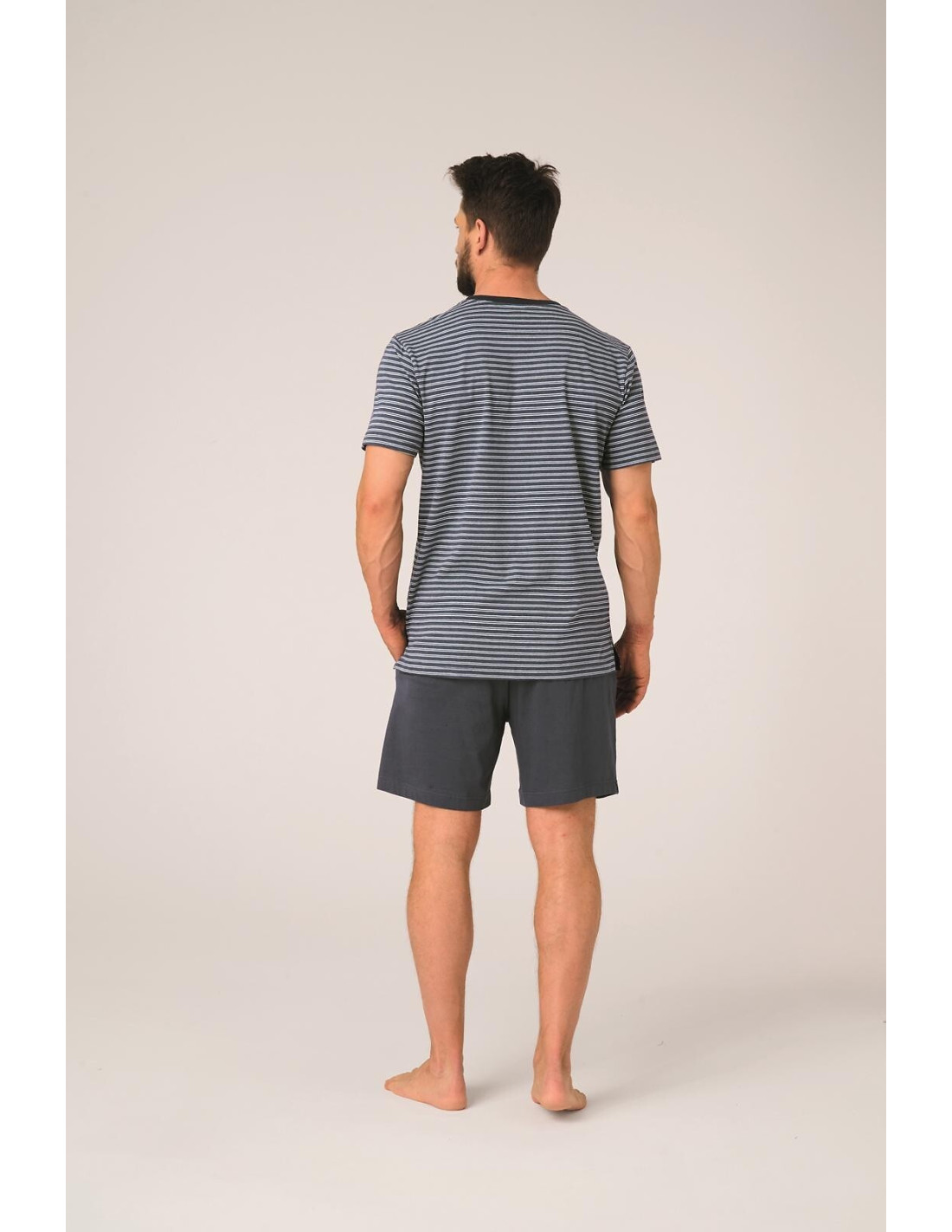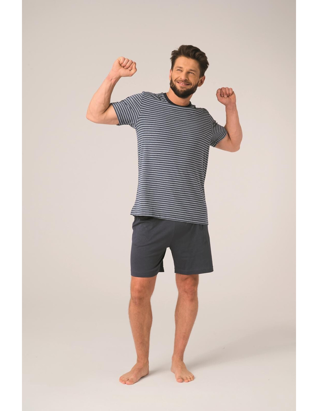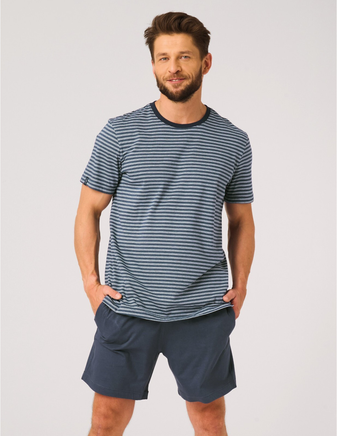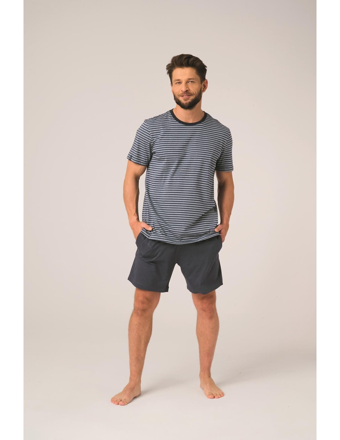 Piżama męska- z wysokiej jakości bawełny- koszulka z krótkim rękawem- półokrągły dekolt - ozdobiona wzorem w paski- do kompletu krótkie spodenki- wygodne kieszenie po bokach
