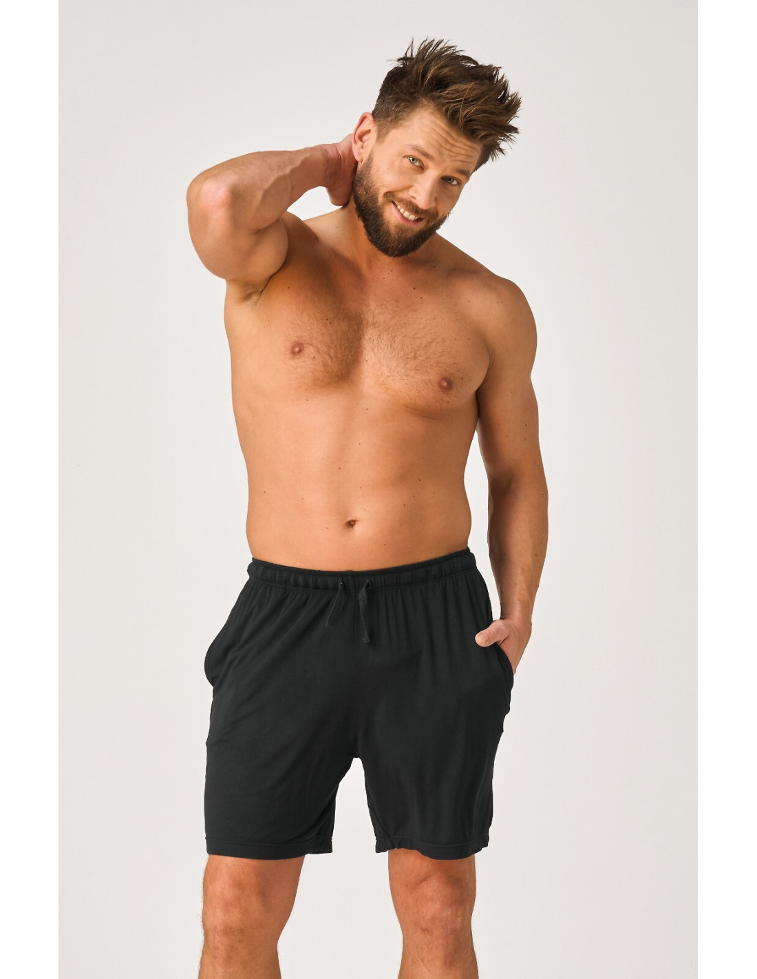 Spodenki męskie - miękka, przyjemna w dotyku bambusowa dzianina - luźny, wygodny krój z nogawką przed kolano - po bokach wygodne kieszenie - w pasie gumka obszyta dzianiną z troczkami do regulacji obwodu