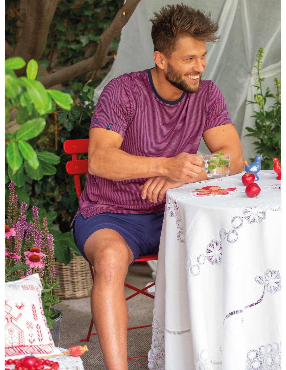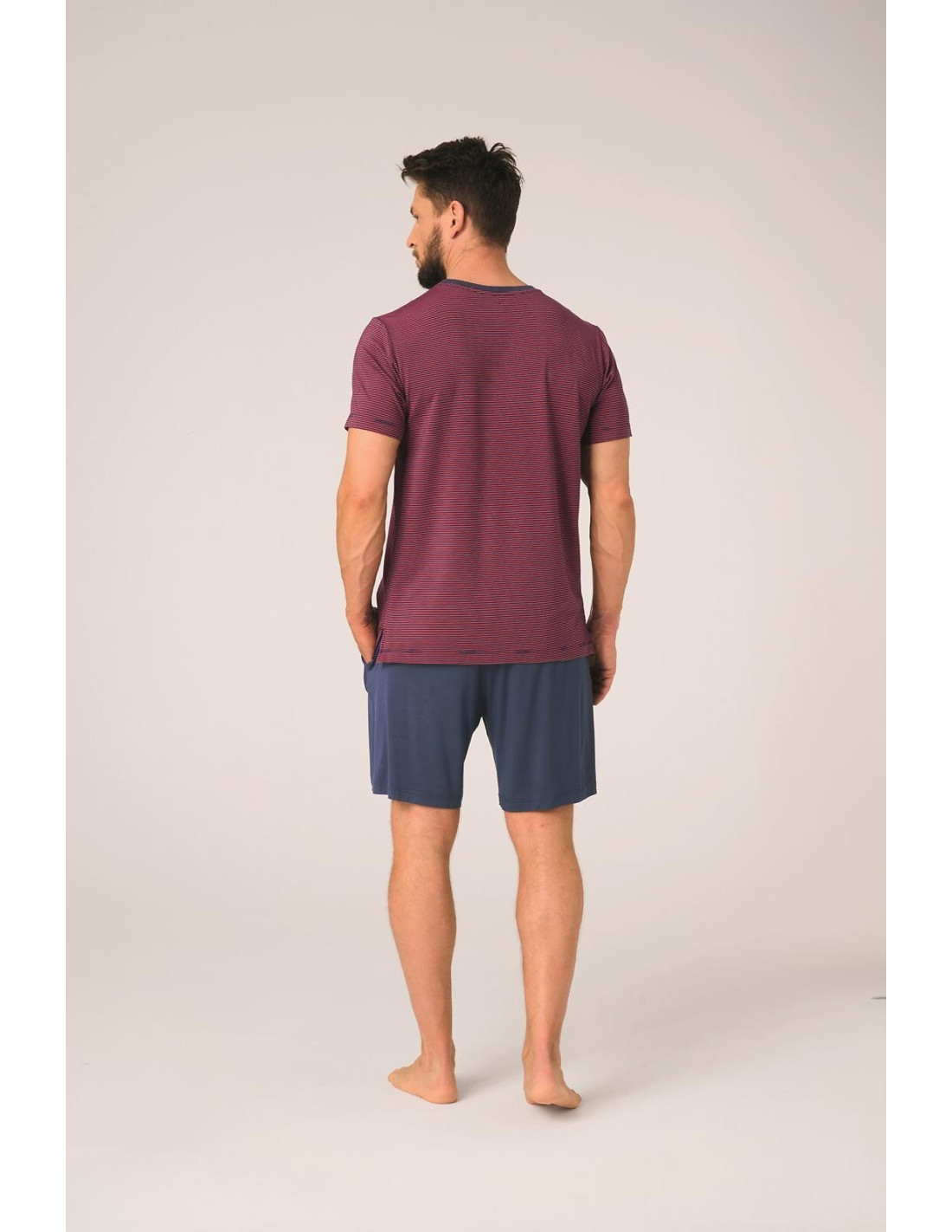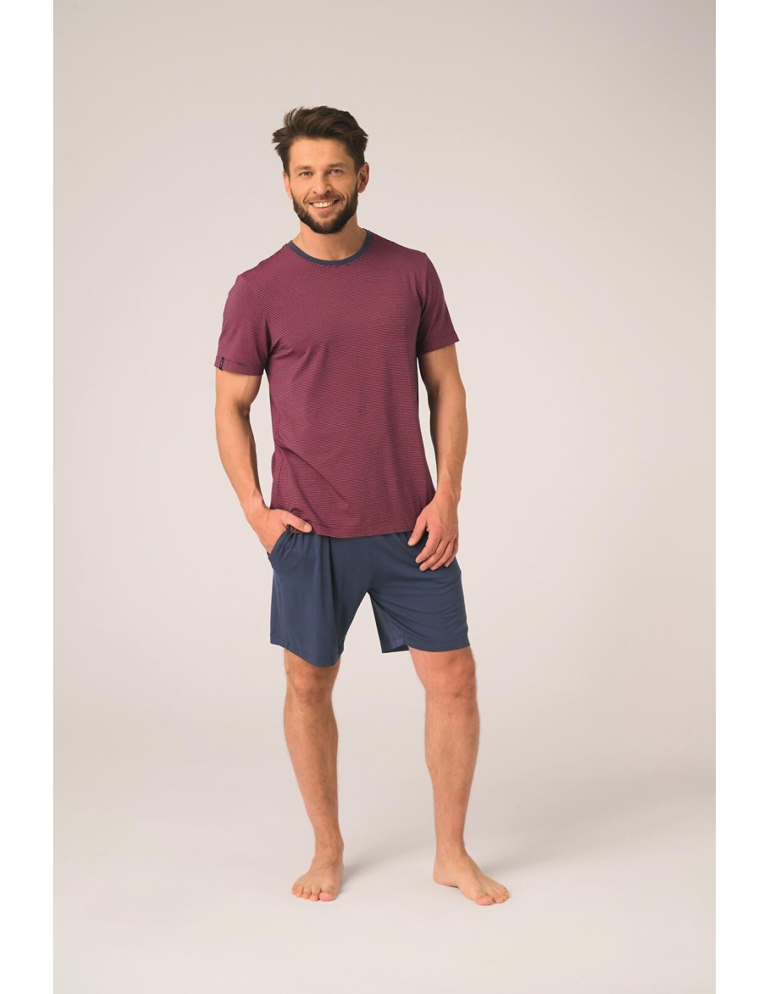 Piżama męska- z wysokiej jakości wiskozy- koszulka z krótkim rękawem- dekolt półokrągły- ozdobiona wzorem w paski- do kompletu krótkie spodenki- wygodne kieszenie po bokach