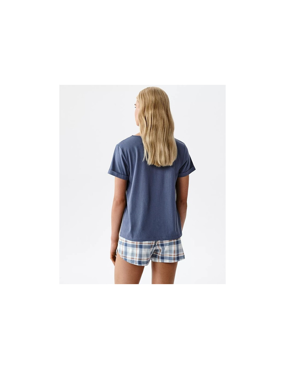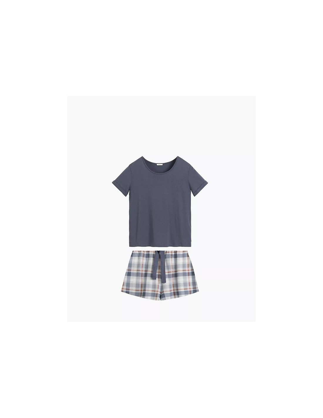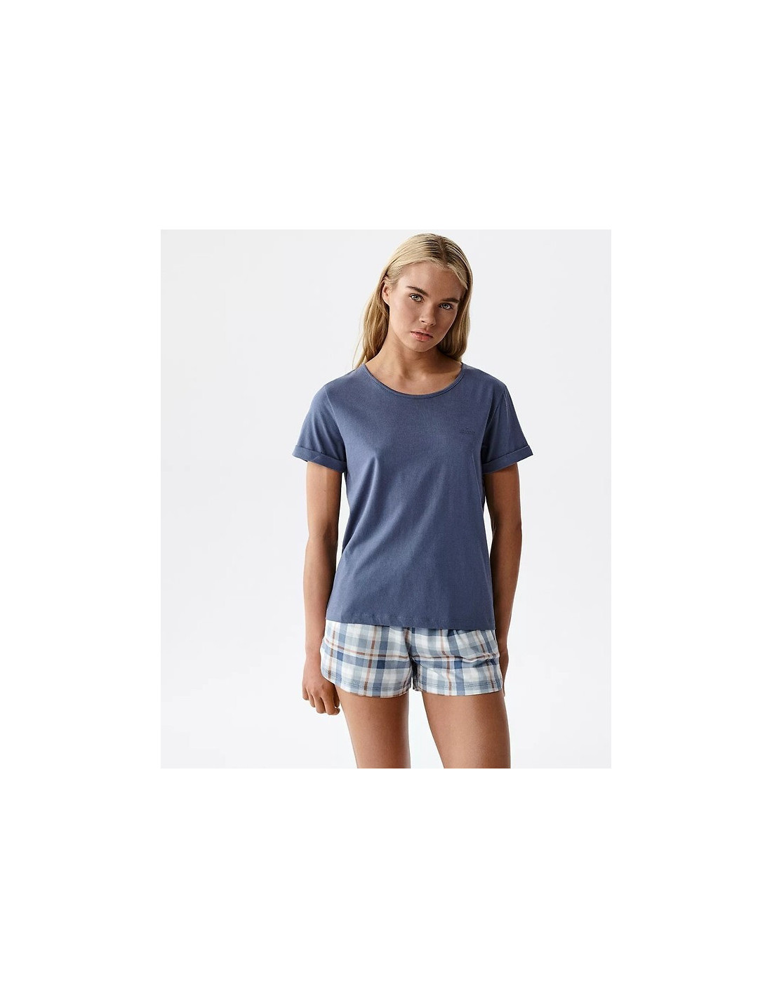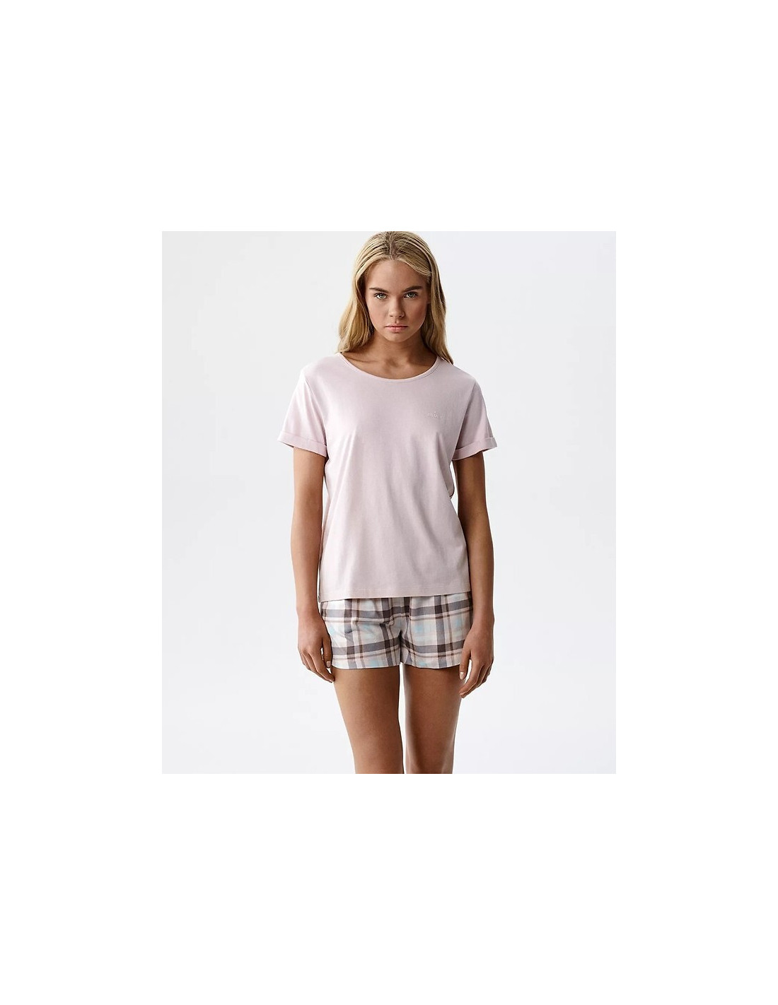Piżama damska z modalu - koszulka z krótkim rękawem - przód zdobi delikatny napis - okrągły dekolt - wzorzyste szorty - na wysokości bioder wygodne kieszenie - pakowana w pudełko