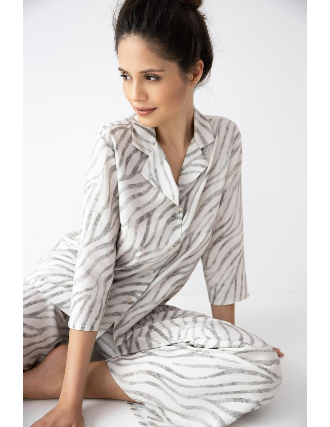 Piżama damska - lekka, przewiewna tkanina wiskozowa - koszulka z rękawem 7/8 - z kołnierzykiem, zapinana na guziki - do kompletu długie spodnie - luźny, swobodny fason - pakowana w foliowy worek