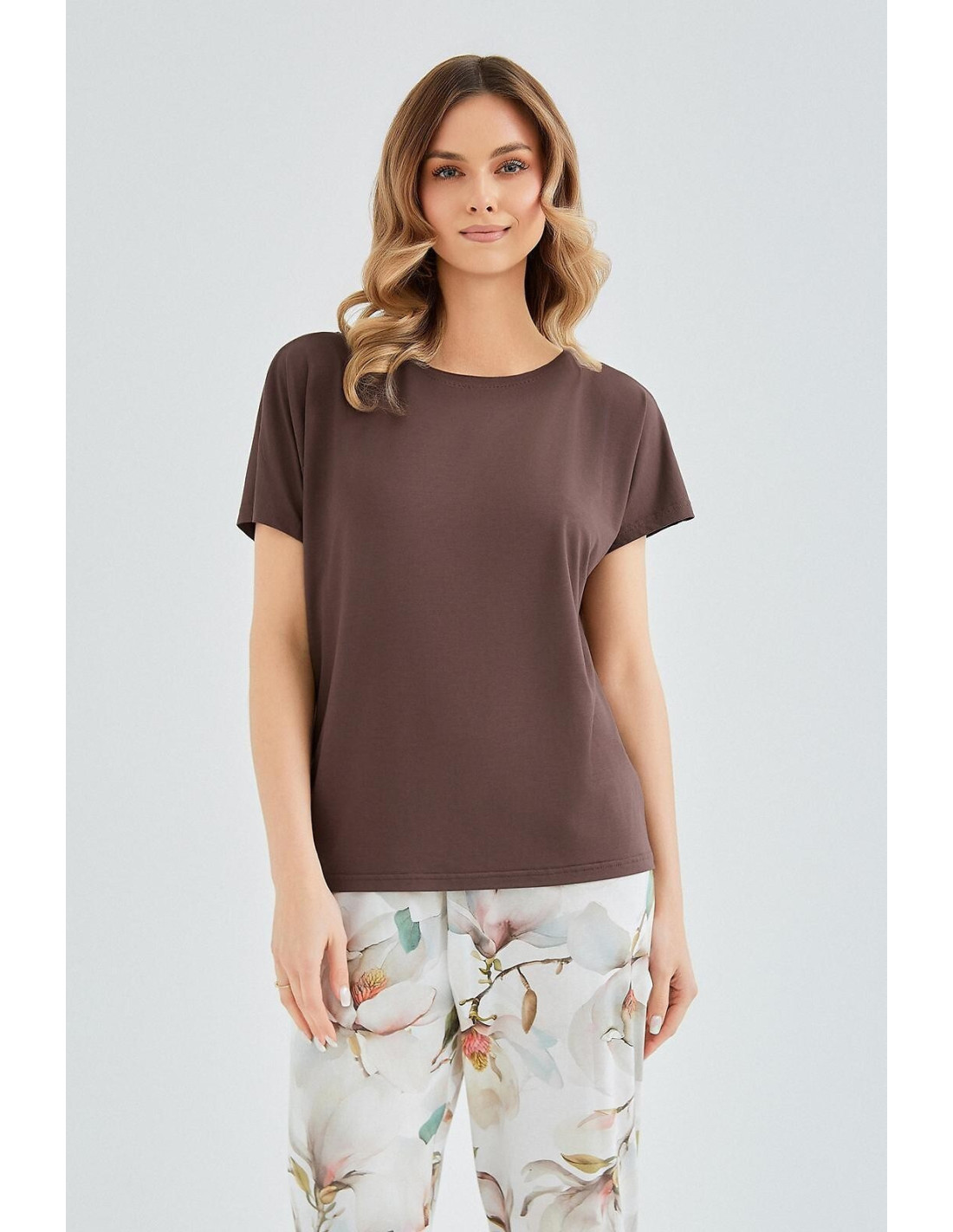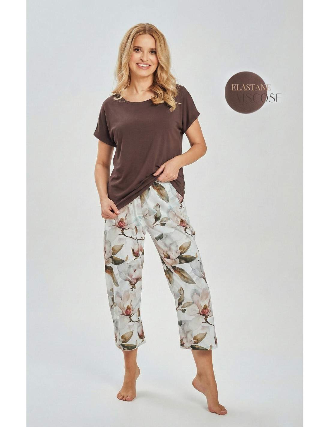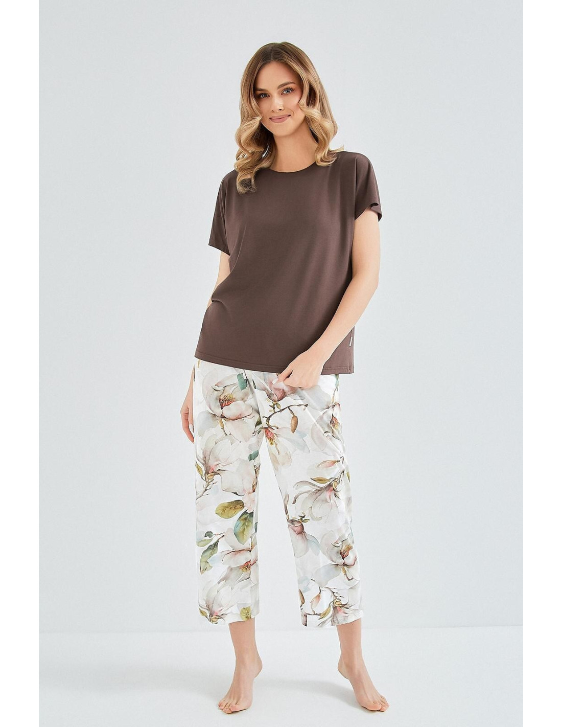 Piżama damska - wiskozowa koszulka z krótkim rękawem - gładka, jednolita - dekolt okrągły - bawełniane spodnie ozdobione kwiatowym printem - długość 7/8 - pakowana w foliowy worek