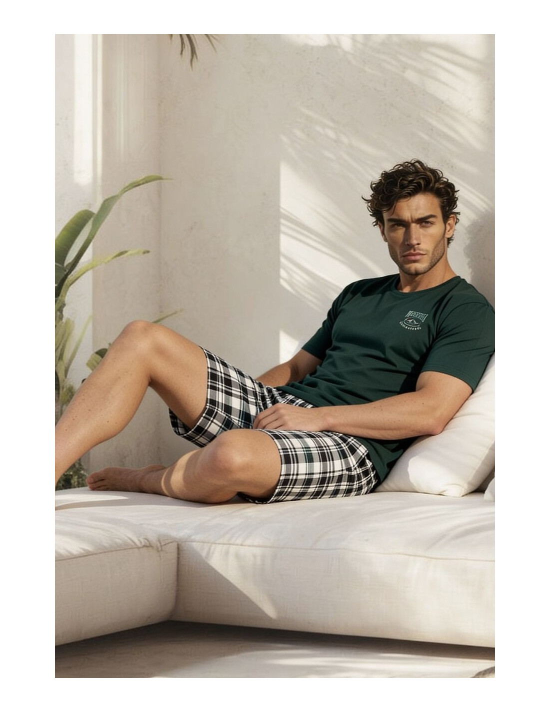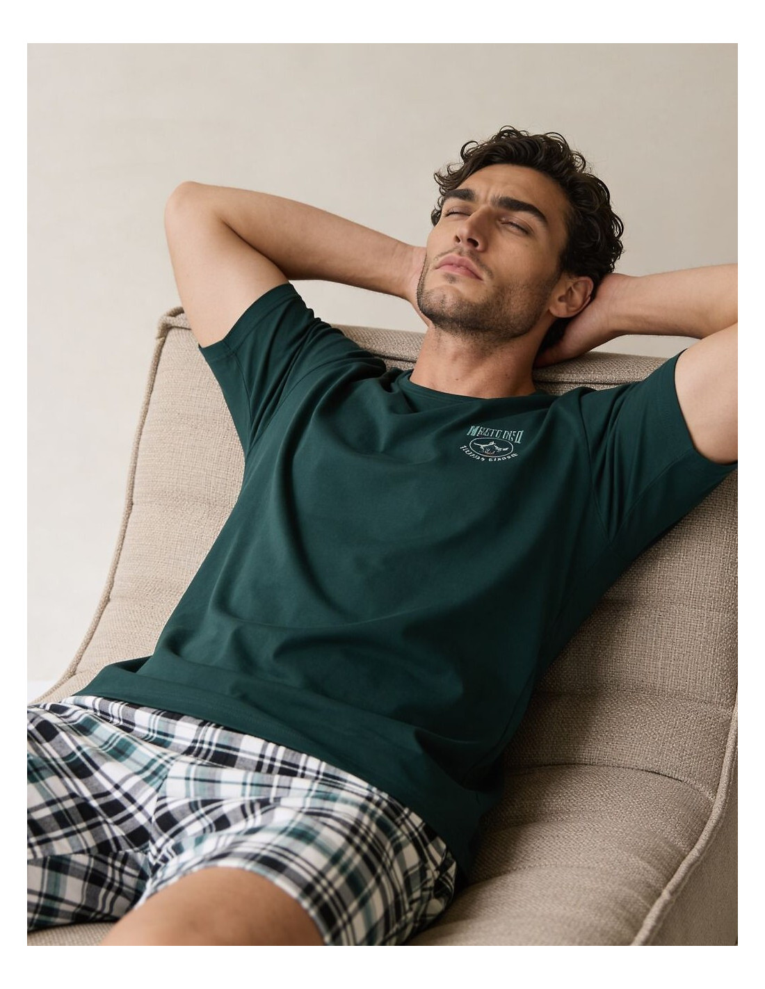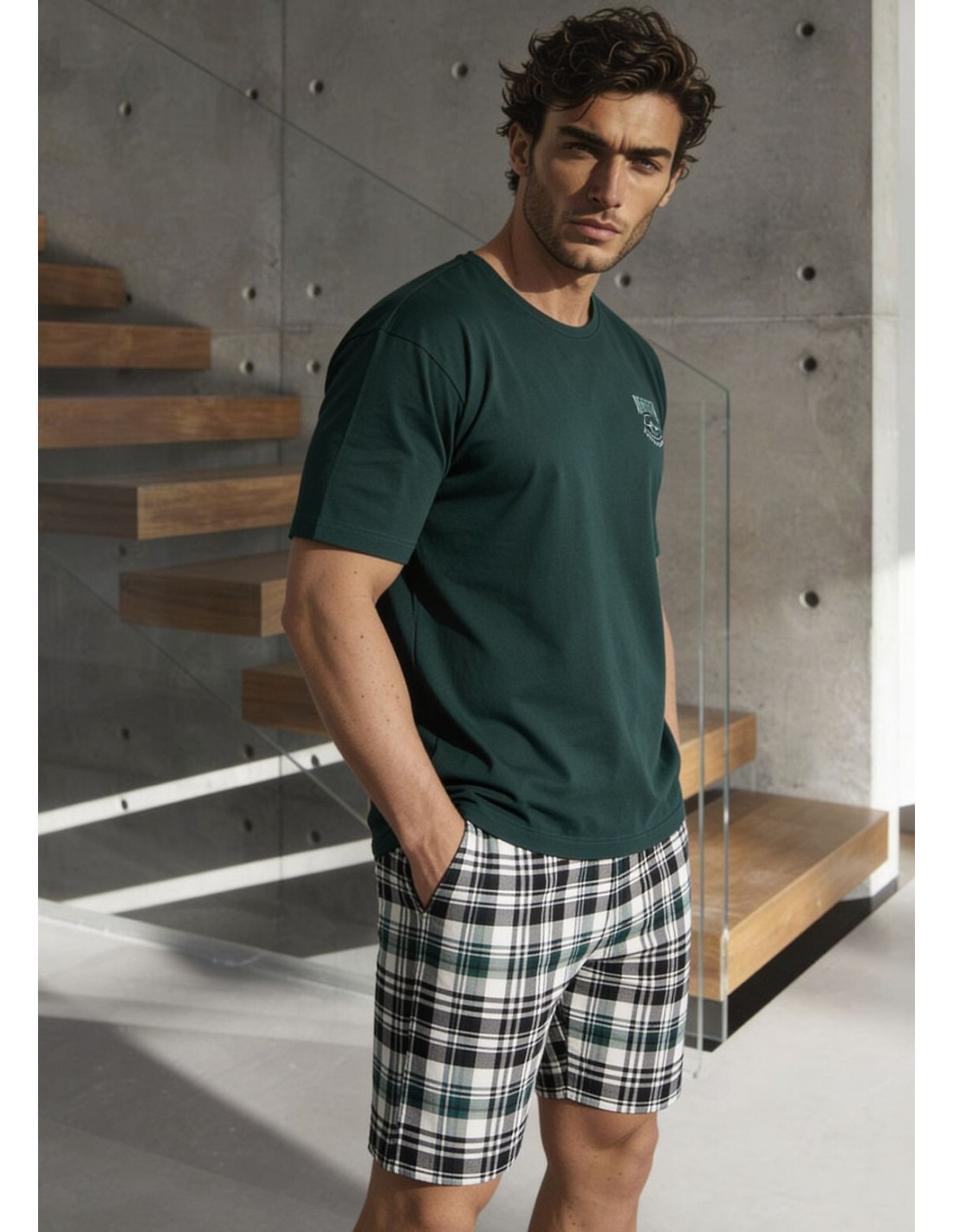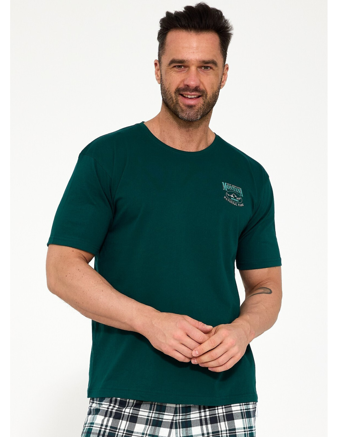 Bawełniana piżama męska - koszulka z krótkim rękawem - półokrągły dekolt - na piersi mały nadruk - krótkie spodenki w kratkę - w pasie gumka obszyta bawełną