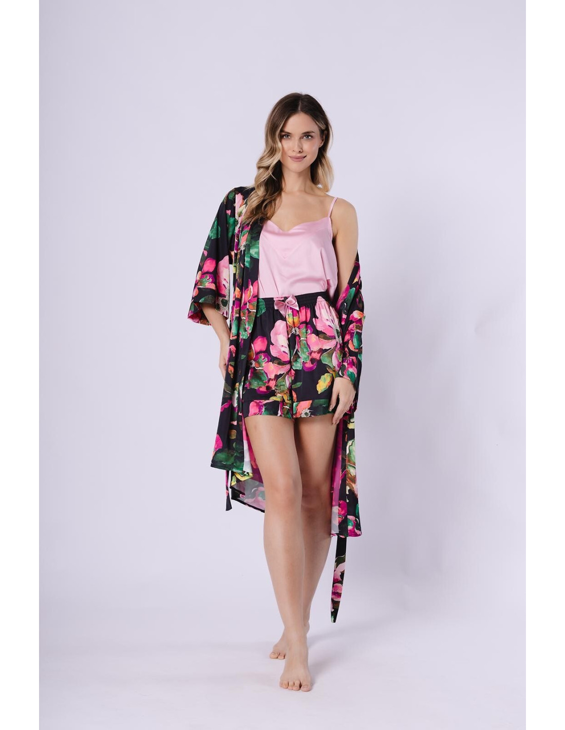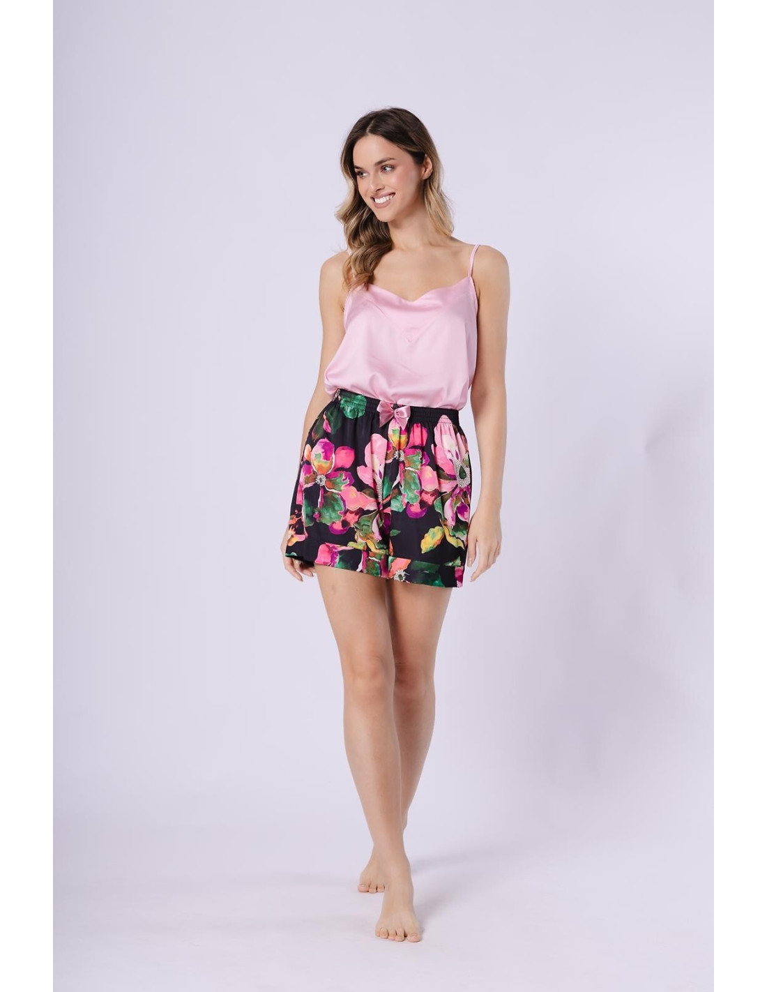 Satynowy komplet damski - luźna, jednolita koszulka - ramiączka z regulacją - szorty krótkie, wzorzyste - w pasie wygodna gumka i ozdobna satynowa kokardka